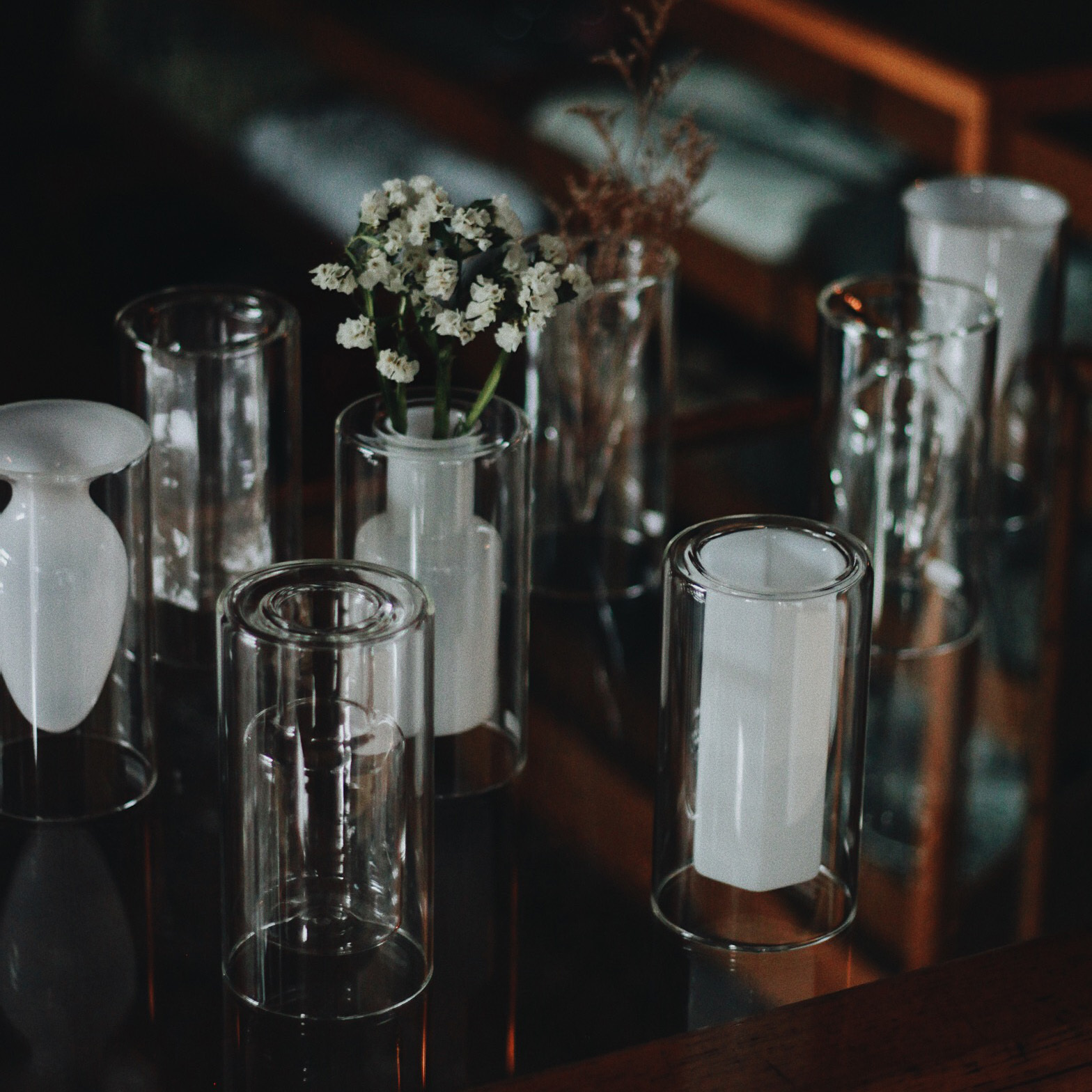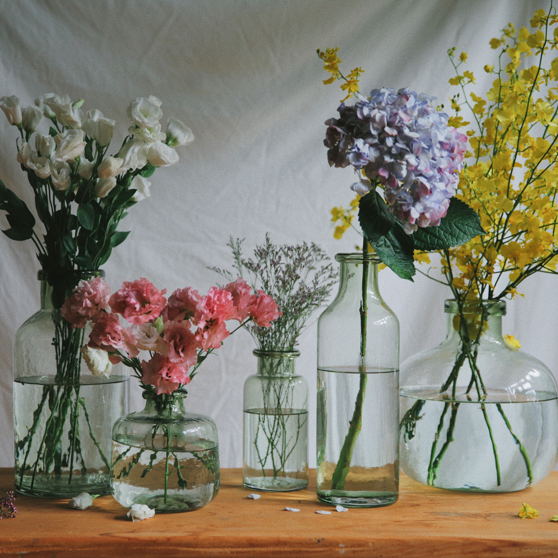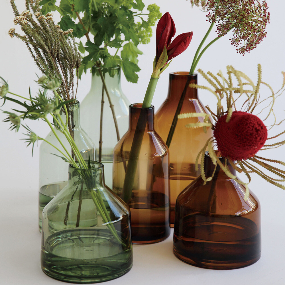 清爽透明的苔綠色花器,大小各式任君挑選,透明款式的花器能完整呈現花材枝椏,也能透出環境的色彩,手工製作讓每件瓶身的紋理獨一無二,無論是當作花器使用或單純擺放,都顯得沈穩大器。