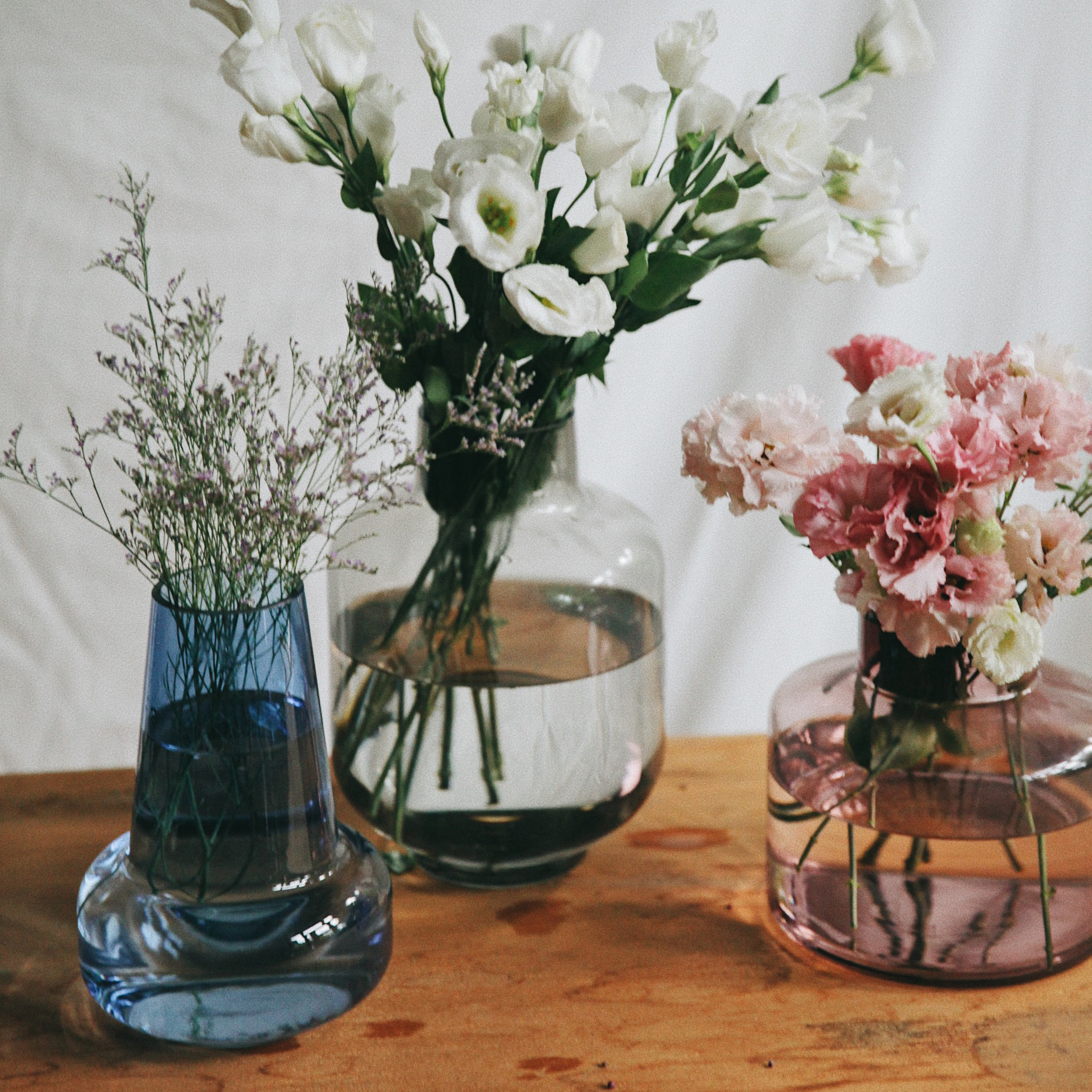 透明清澈的玻璃質感配上穩重又不失活潑的色系,能自由選擇花與花器的組合,環境中單獨擺放花器能增添藝術質感,加了花朵植栽又是另一種柔和的美。