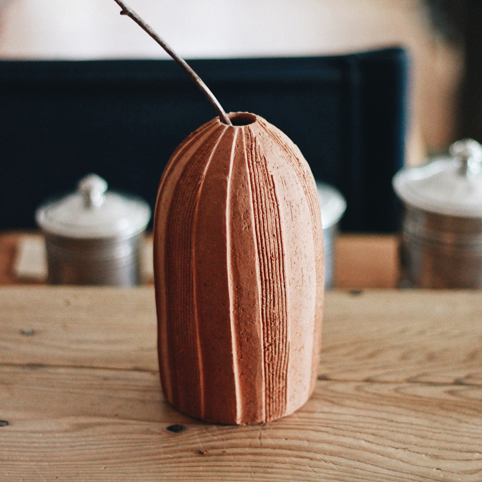 蛋形花器厚實的份量,擺飾起來相當沈穩,有著磨砂顆粒的手感與外觀,土磚橘色也讓整體增加幾分活力。