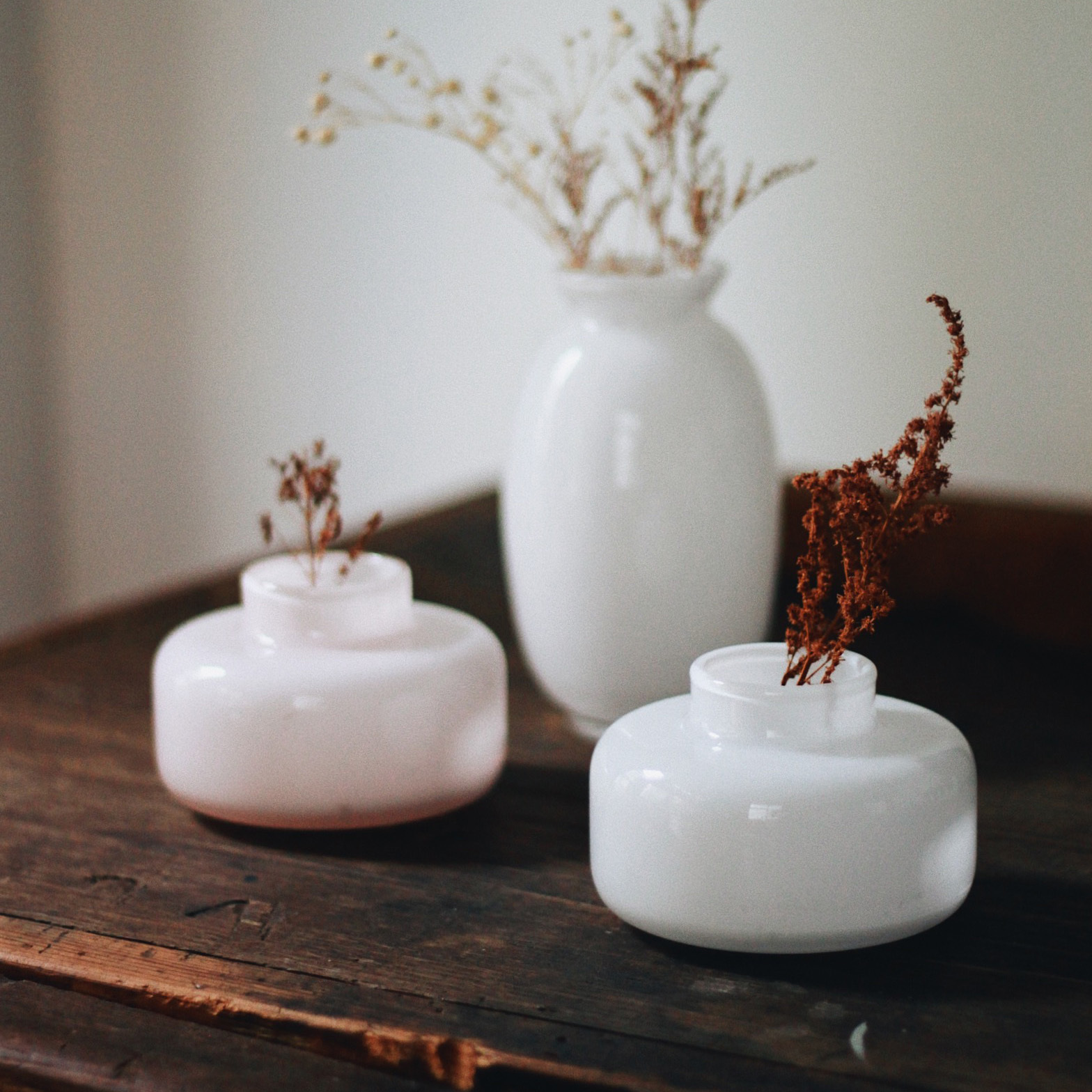溫潤的雪白與透著淡粉的草莓牛奶色,在陽光的照射下邊緣便會反射出柔和的色彩,手工製作的圓滑瓶身清透簡潔,搭配乾燥後的花草更是有著高雅的氛圍魅力。