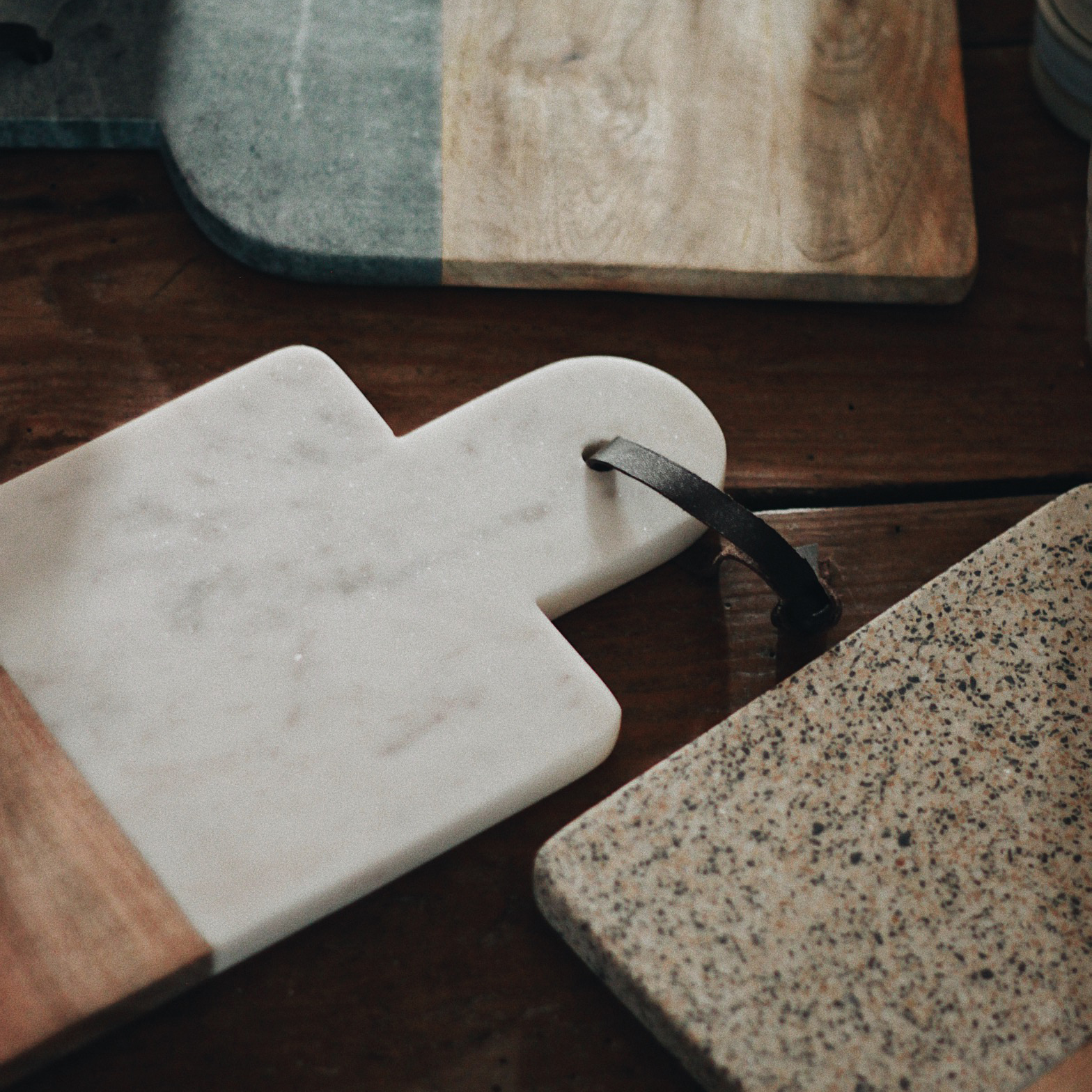 由天然木材與大理石拼接而成的異材質砧板,還有方形的水磨石,每款細膩的紋理皆不相同,石材與木材的結合特別新穎,厚實的手感與視覺,擺放食物或飾品都很高雅。