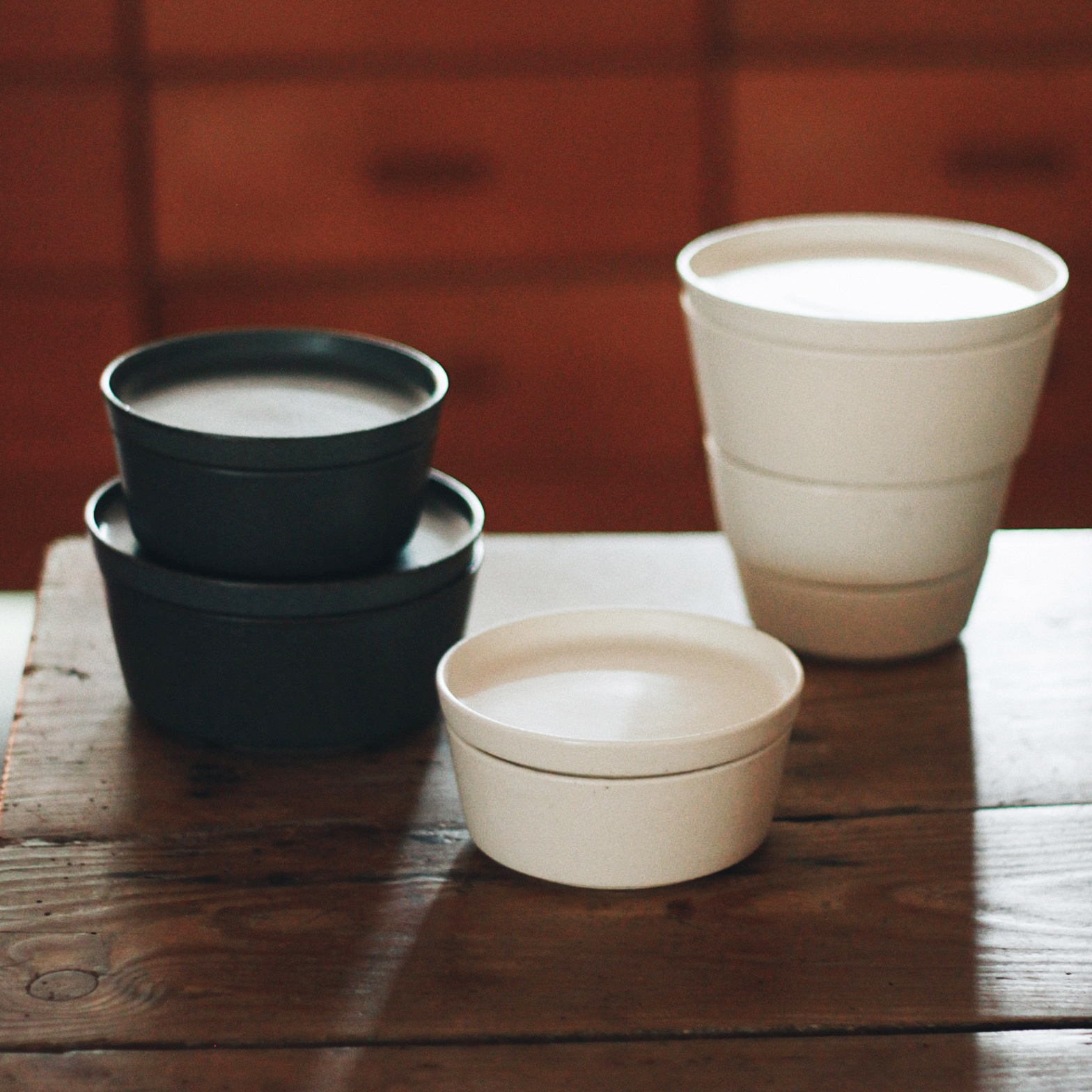 能夠層層疊起,也能依序裝入,一個組合中能分別盛裝主食、湯品與小菜,分別有二層與三層的容量,米白色與灰綠色可以挑選。