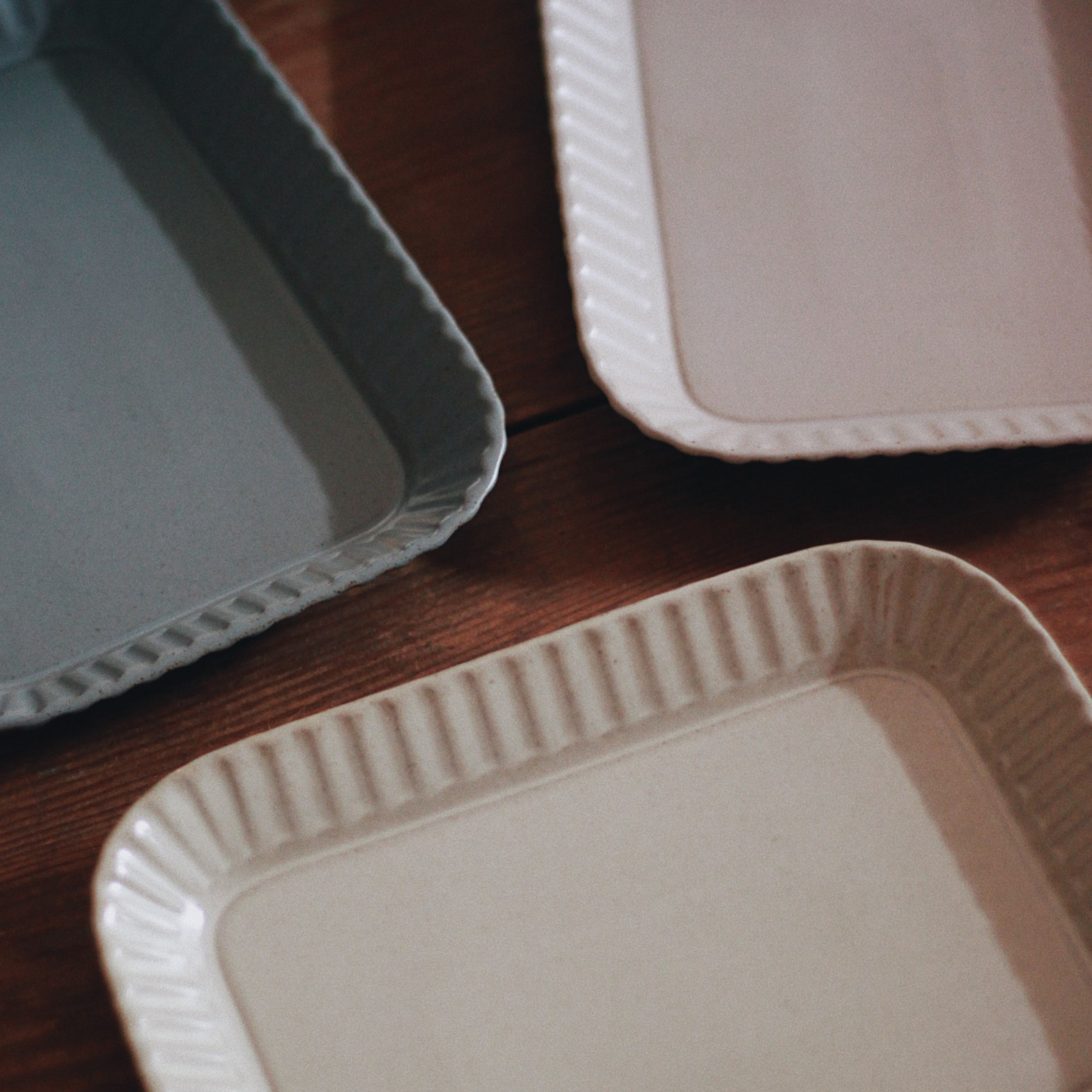 可以當餐盤也適合承裝沙拉、點心、飯麵,顏色分別為淡色溫潤的湖水藍、淺米黃與藕粉灰,有方形與長方形兩種尺寸可供選擇。