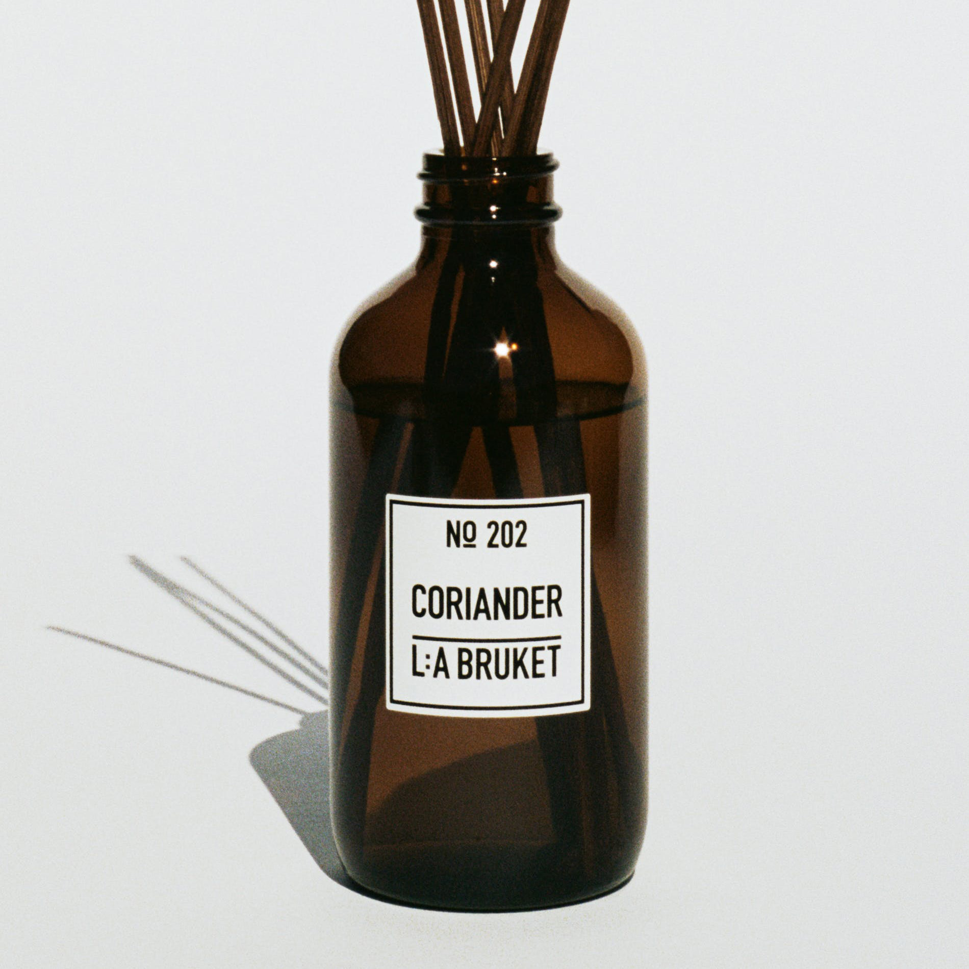 L:A BRUKET推出的擴香系列,琥珀瓶身、深棕色的擴香竹,視覺上營造了穩重與低調的質感,擴香共有葡萄柚、菸草、扁柏、香菜四款香氣。