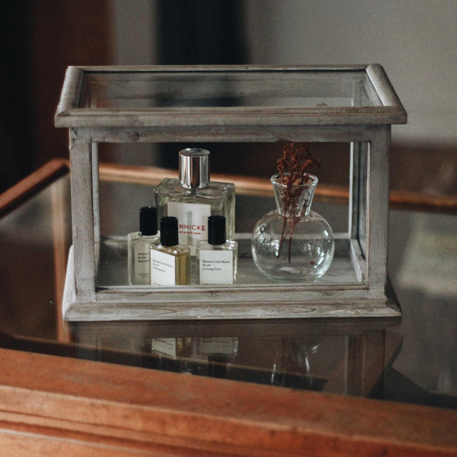 由舊木再製而成,溫潤樸質的紋理氛圍,四面玻璃能夠保護物品與防止灰塵與髒污,後方為簍空設計方便拿取物品,無論是甜點、手作品、各式收藏,都能零死角的進行展示。