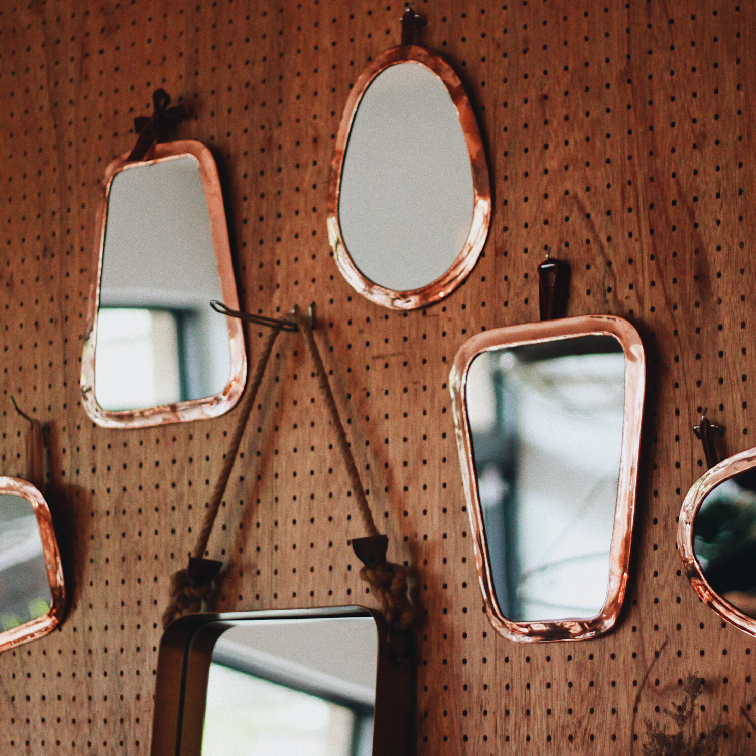掛鏡邊框為少見的紅銅材質,手感輕薄不過重,隨著使用時間,紅銅邊框也會因氧化產生色澤變化、使其更加自然復古。造型分別為蛋形與梯形,可以依照居家風格做挑選。