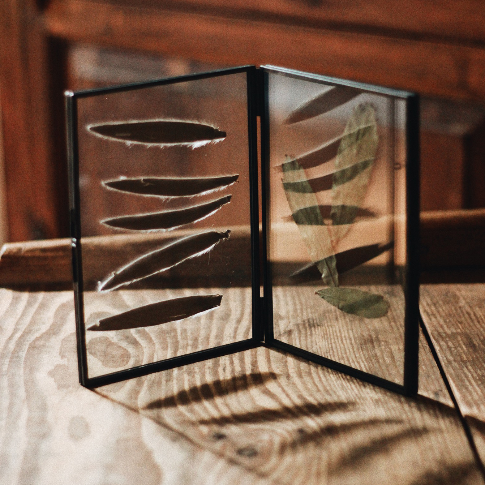 雙面相框能如書本般開闔、兩側各自有夾,除了雙面展示,也能各自打開夾層以浮貼方式貼上物件,搭配透亮的玻璃進行360度零死角的展示。