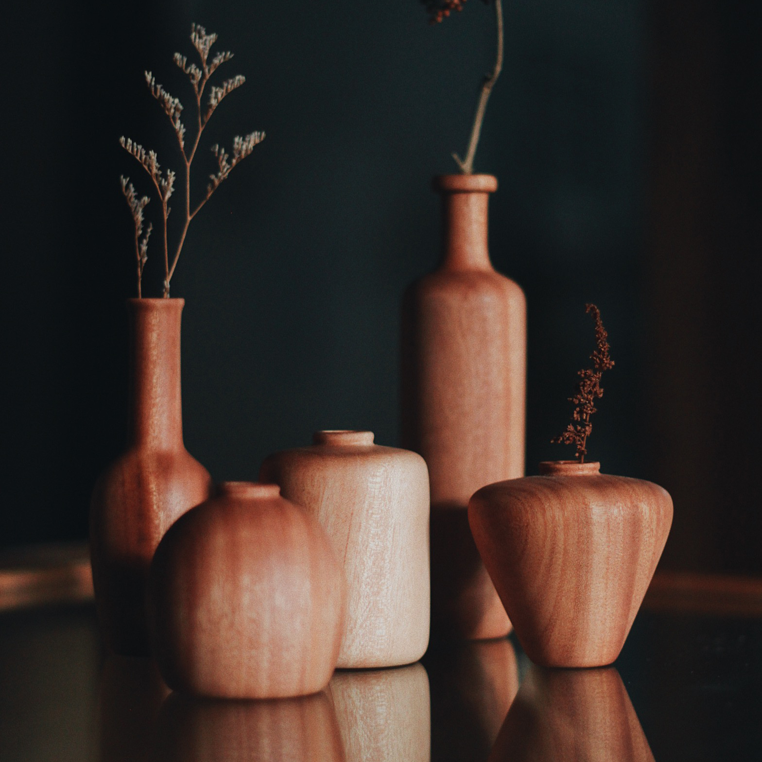 小巧可愛的桃花心木花器,木製質感沈穩高雅,造型上也不失趣味。總共五款造型,居家、書桌、辦公桌,隨處擺放都能點綴氛圍。