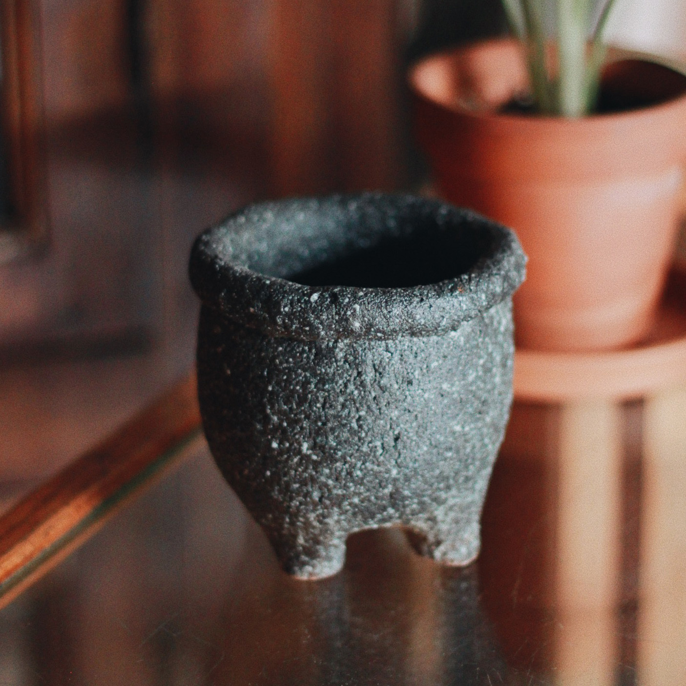 石礫般的觸感與黑色釉料,帶著粗獷率性的風格,小盆器卻十分有份量,底部的圓孔可以幫助土壤將多餘的水分排出,圓圓胖胖的造型十分討喜,相當適合塊根等迷你植栽使用。