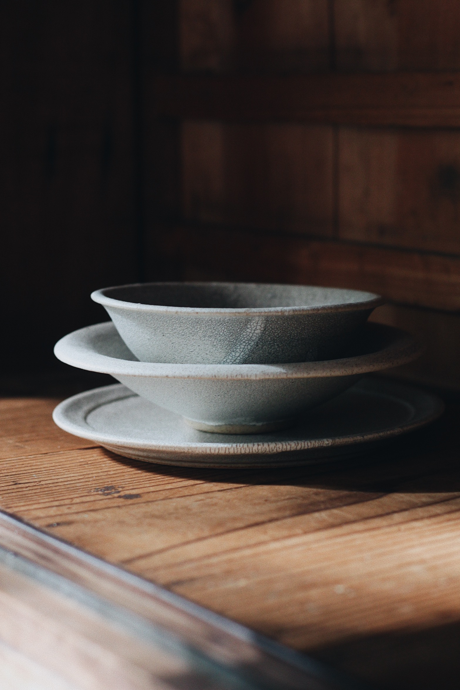 盛裝豆花的器皿來自日本的梅花皮餐器系列,為美濃燒中的姿月窯所生產,釉面因燒製而收縮,呈現出獨特細緻的裂紋為其特色,因紋理相似於盛開的梅花枝故稱作「梅花皮」,每款的紋理皆是獨一無二,更會隨著使用時間展現出日常的痕跡變化。