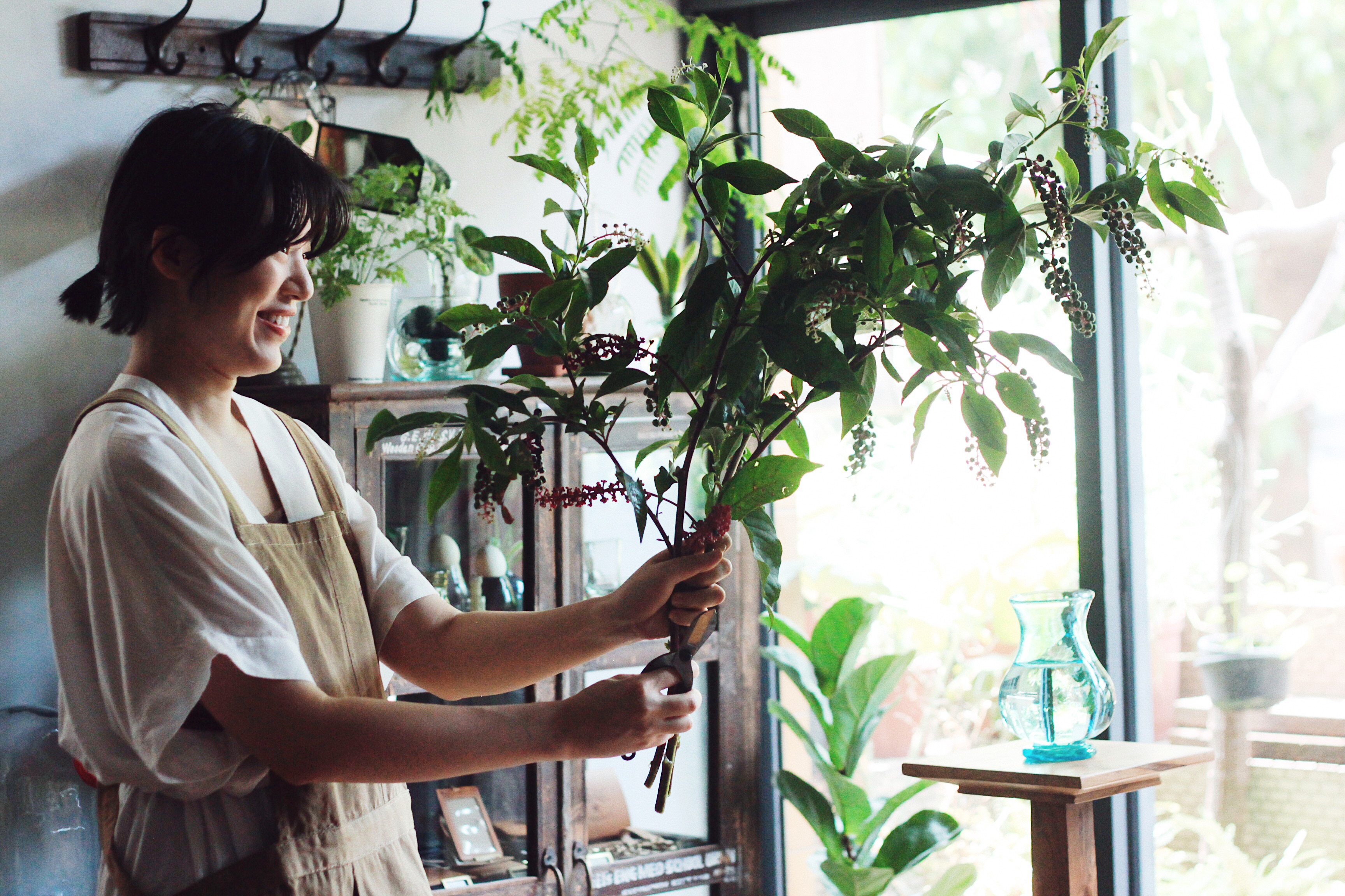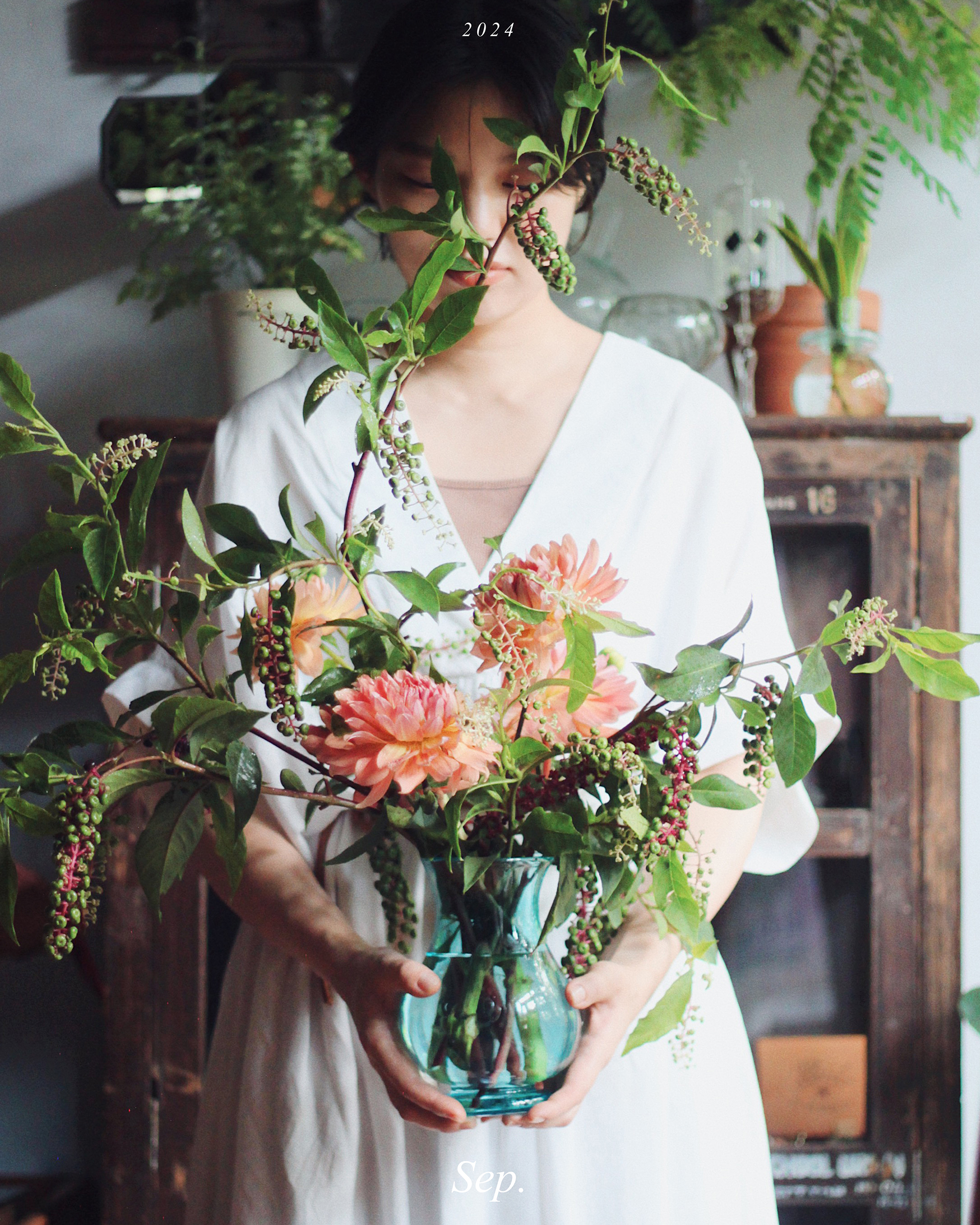 在九月的第一天我們選用 La soufflerie 法國玻璃品牌的 Pichet 花器與兩種花材,營造出立秋後仍綠意盎然、生機滿滿的豐富氛圍。