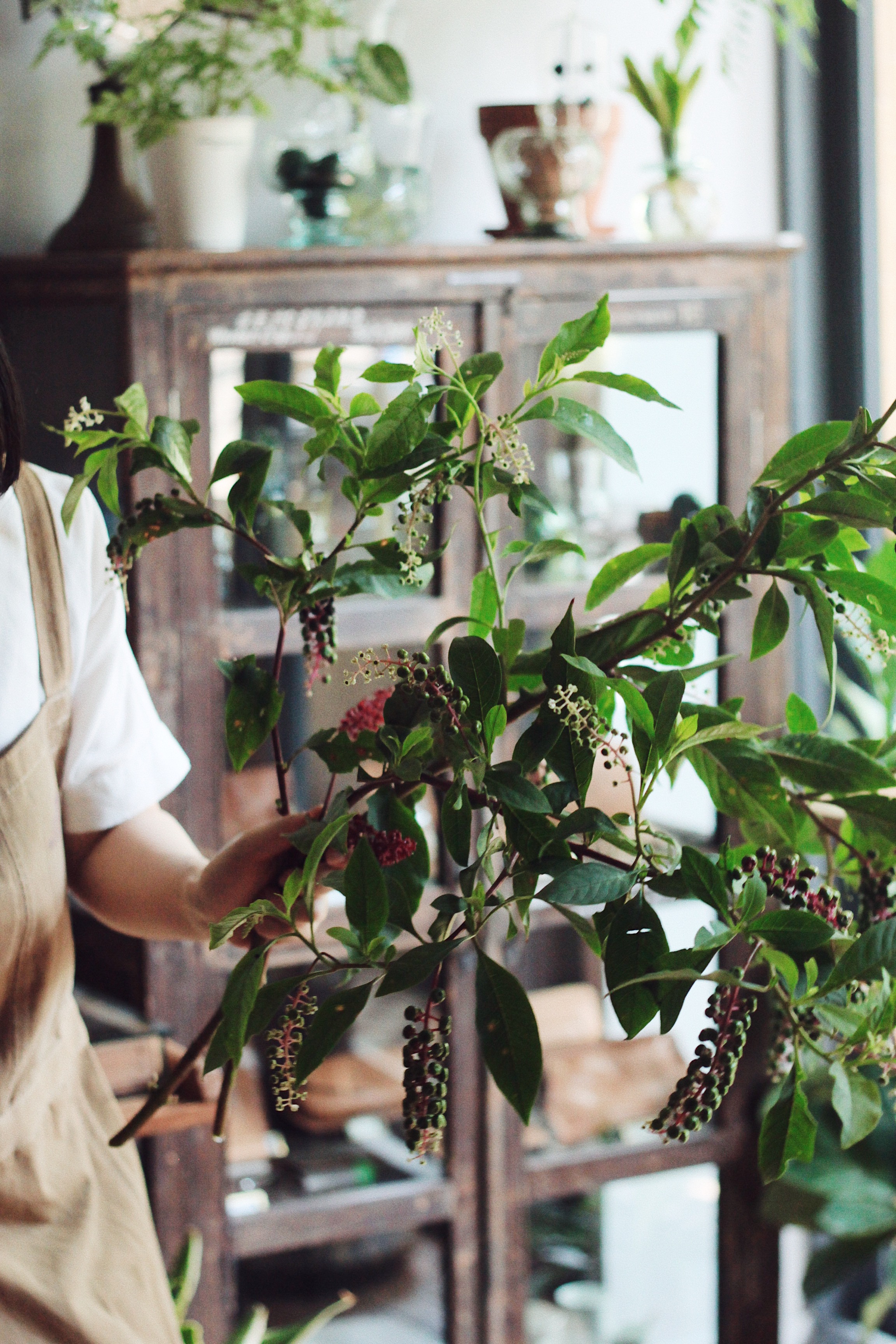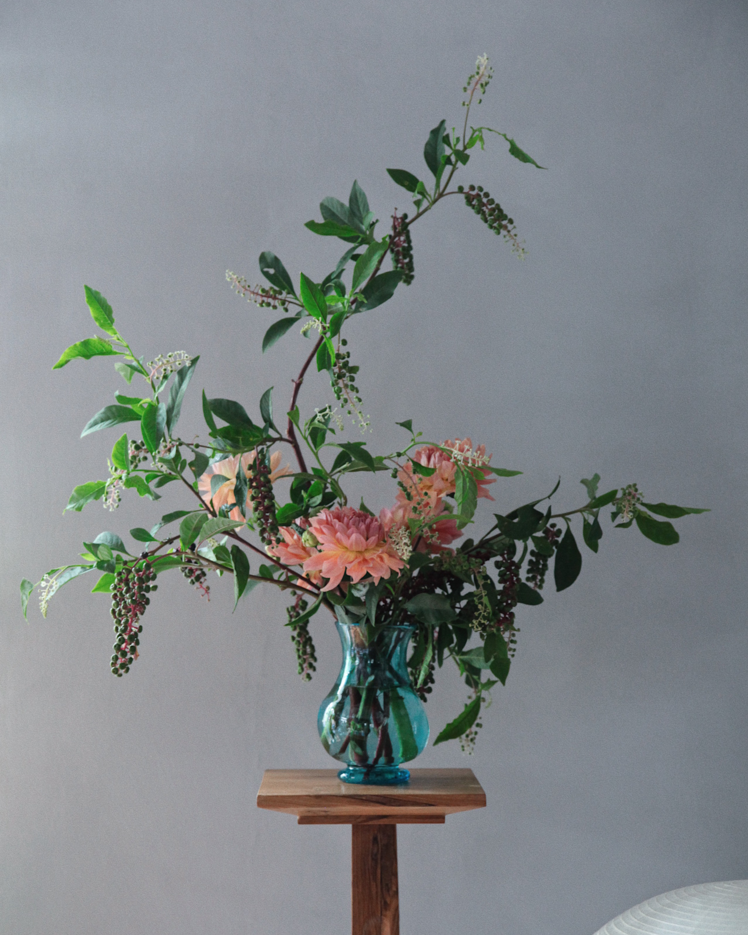 花芯的深粉色與商陸的漿果串呼應;向外延伸的桃粉色以及花瓣底部微微綻放的金黃色,與搭配的水藍色花器成對比,三者之間相互平衡、彼此襯托。