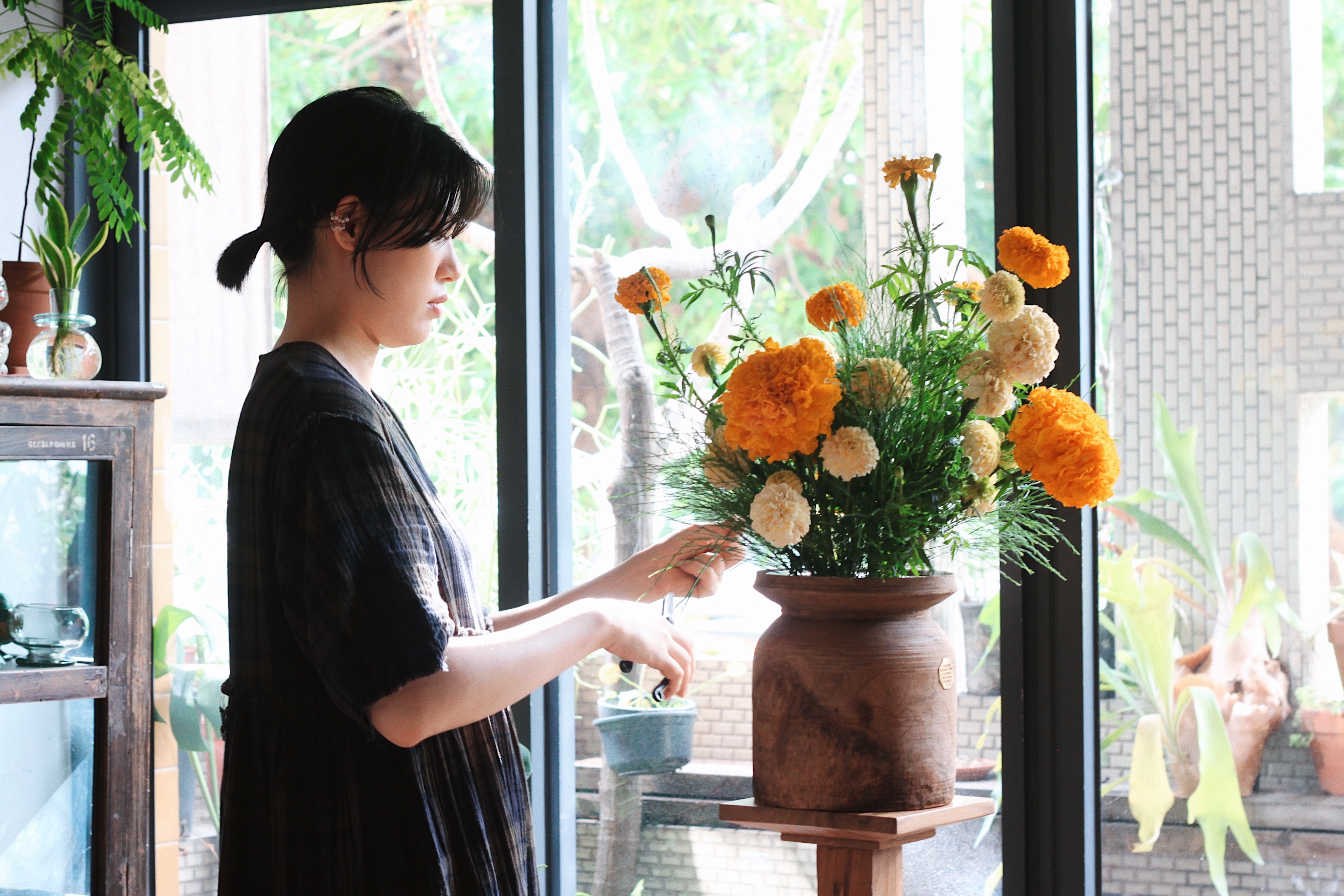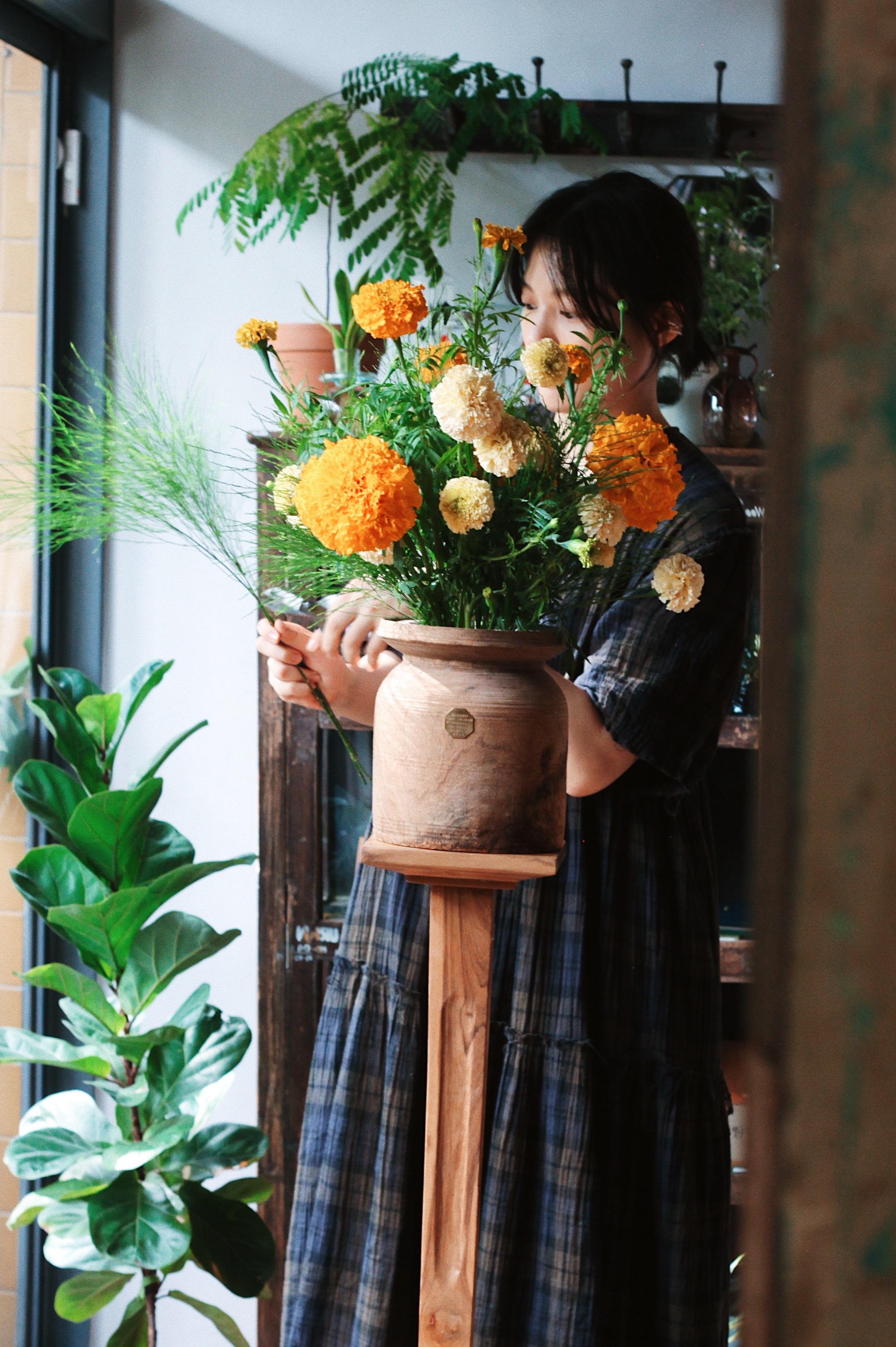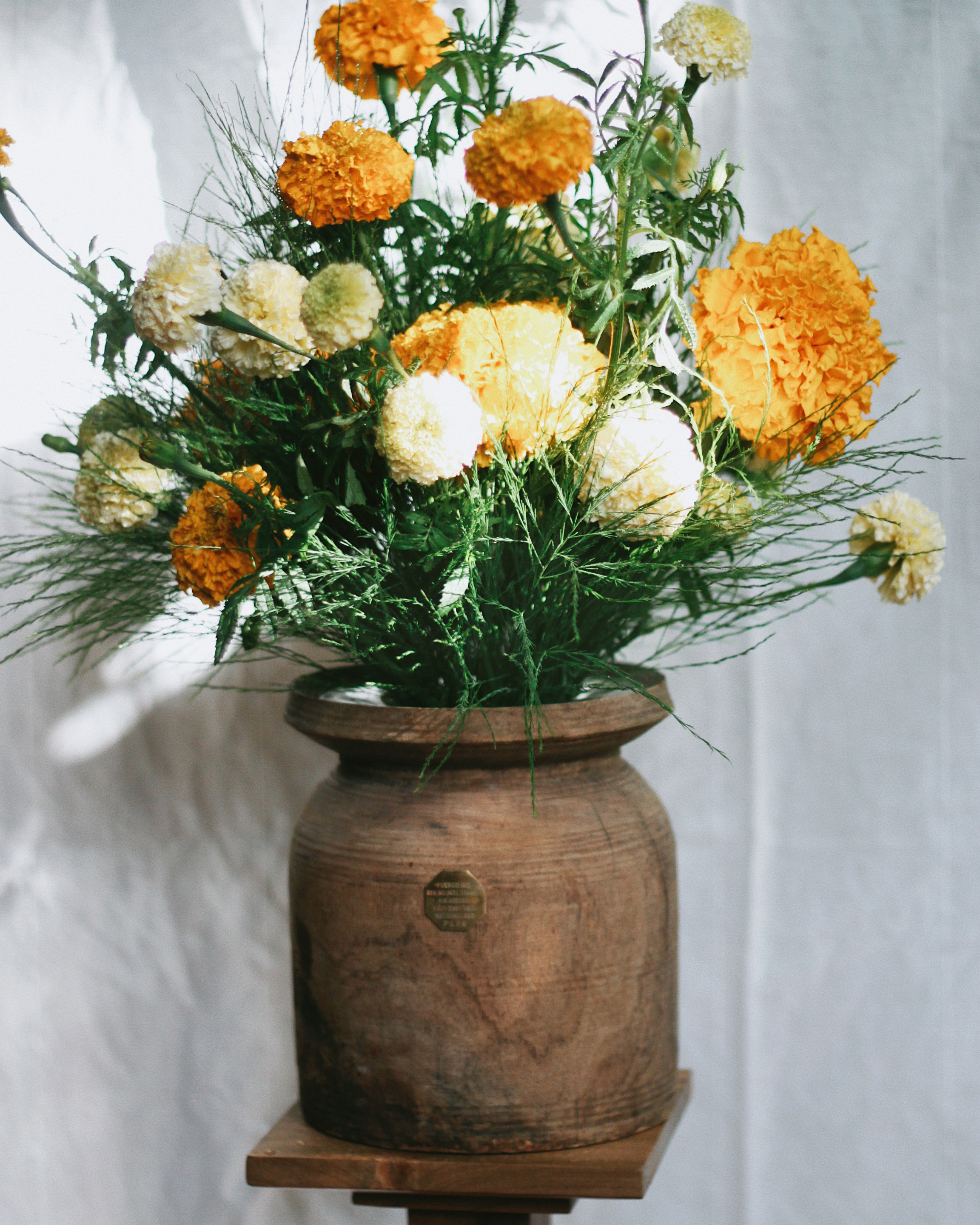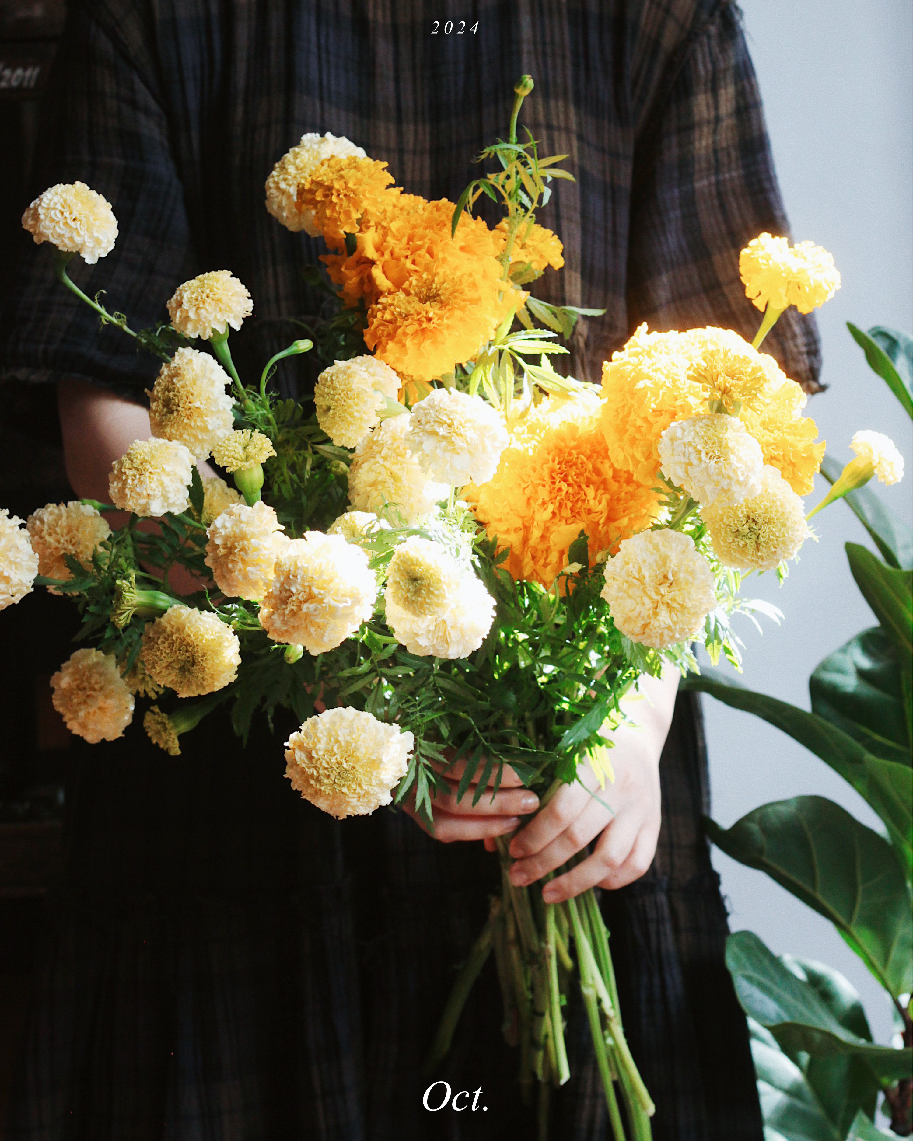 十月誕生的萬壽菊,花語如名有長壽多福、健康、永駐青春之意;平時常見的品種是濃濃秋意的鮮橘色,今天再選擇了帶有奶油色澤的花種一起做調和,增加整體明亮度。