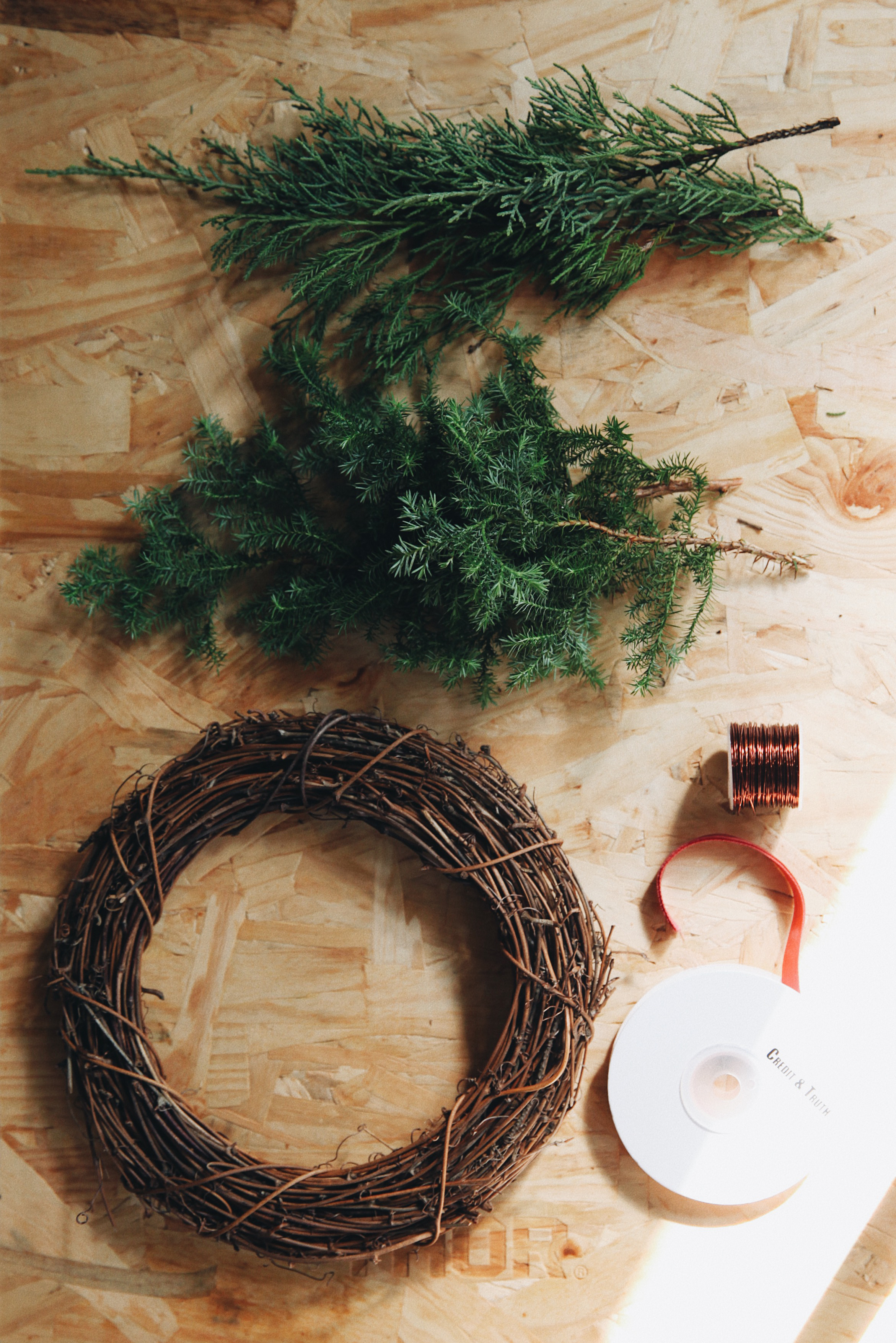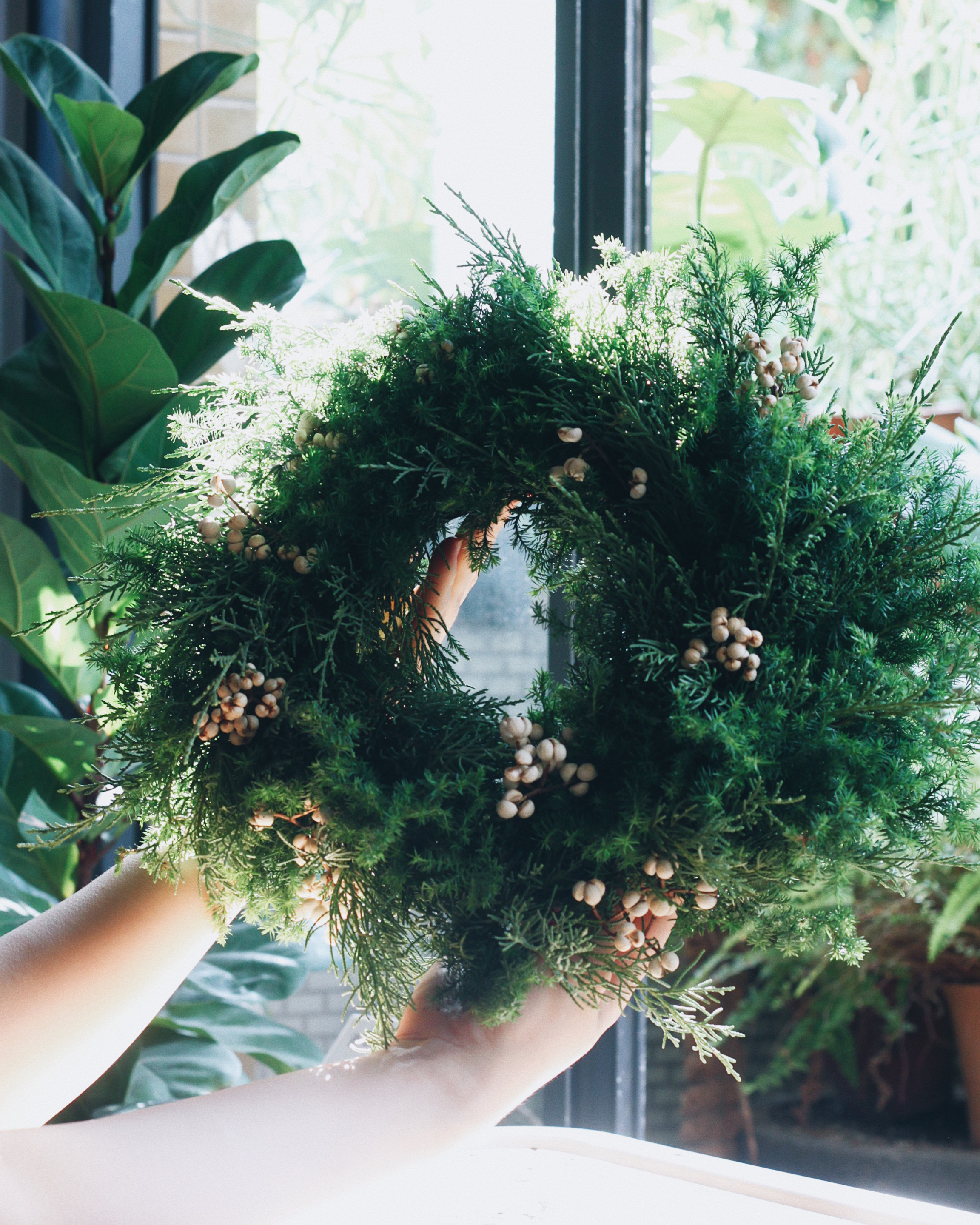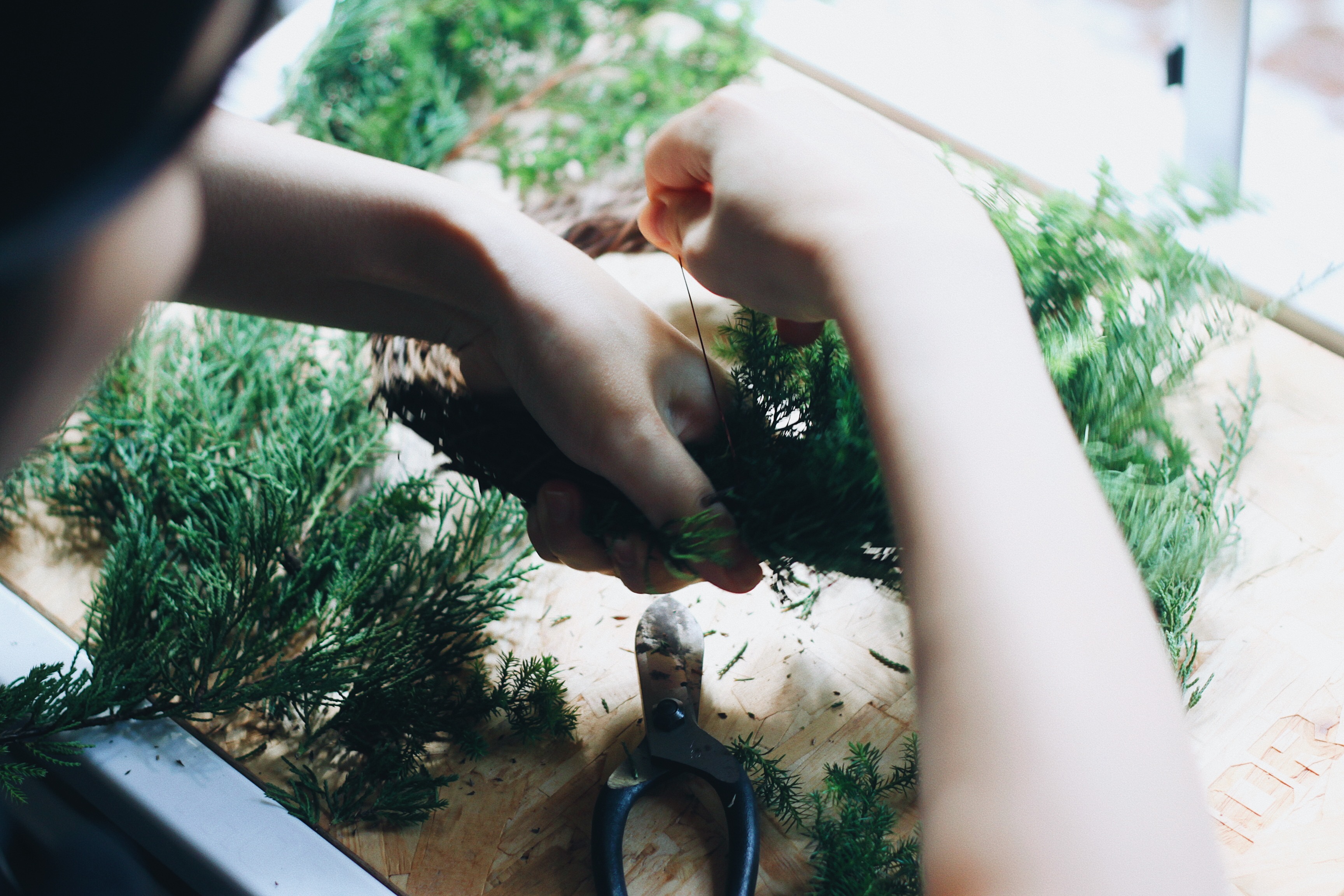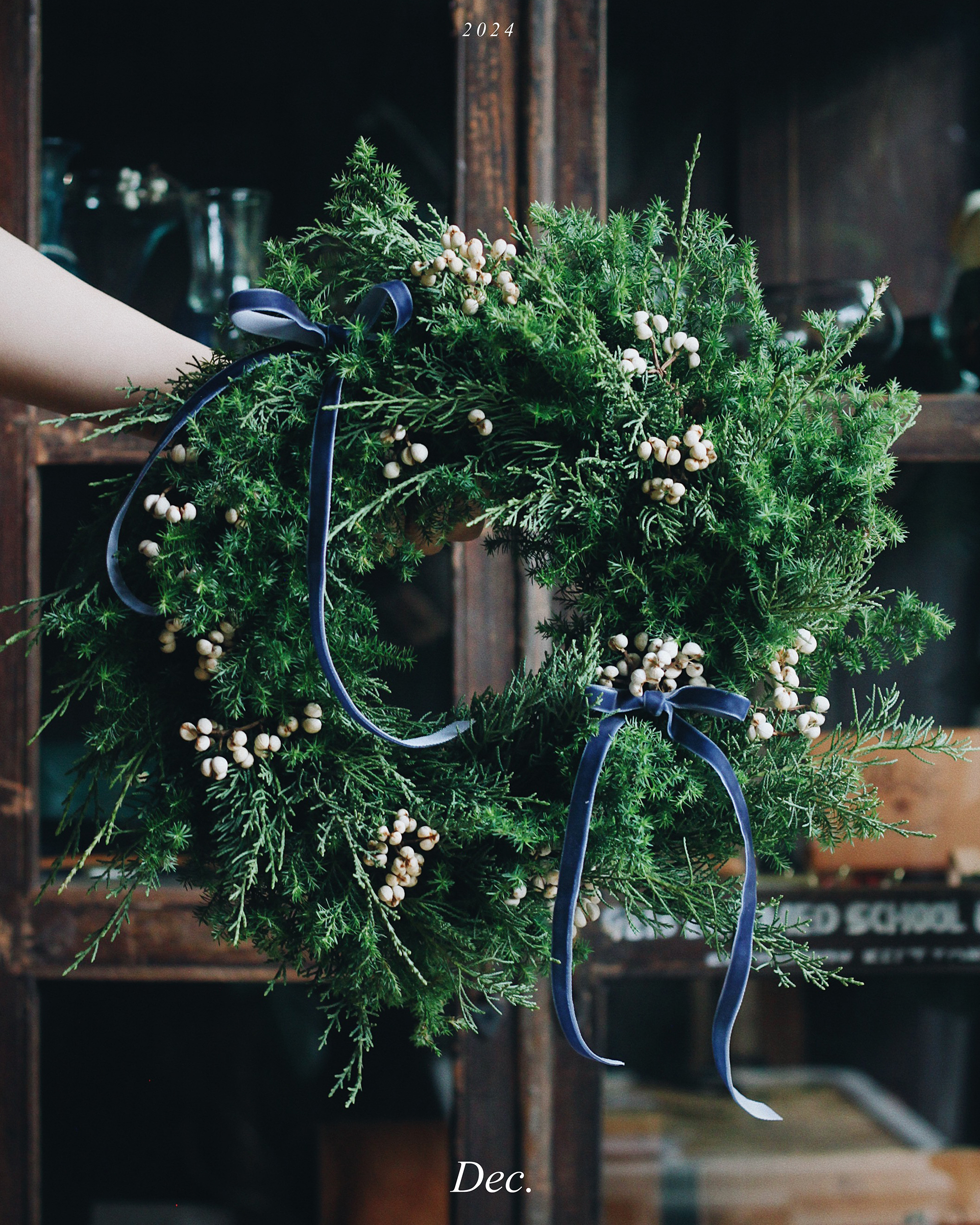 使用兩種不同品種的雪松及如同白色小雪點的烏桕果實,就能完成簡單好看的聖誕花圈。將枝材剪成小段,照著自己的喜好順時針或逆時針,以銅線扎實綑綁於藤圈上,最後再裝飾上喜歡的緞帶或是松果,屬於自己的聖誕花圈便完成囉!