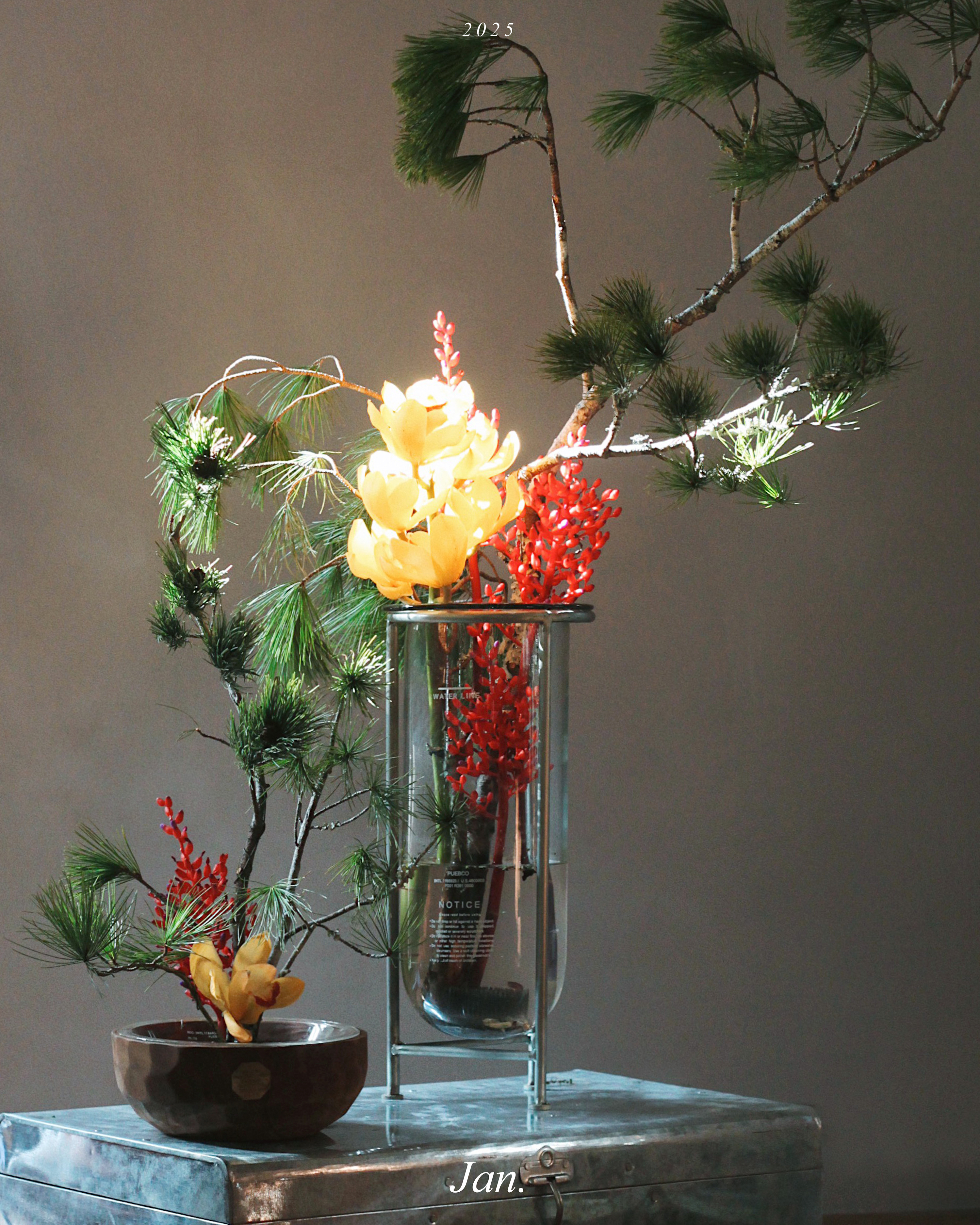 在元旦選用象徵生命永存的五葉松、充滿活力能量的金色虎頭蘭及燦爛完美的珊瑚鳳梨做組合,喜迎2025年。