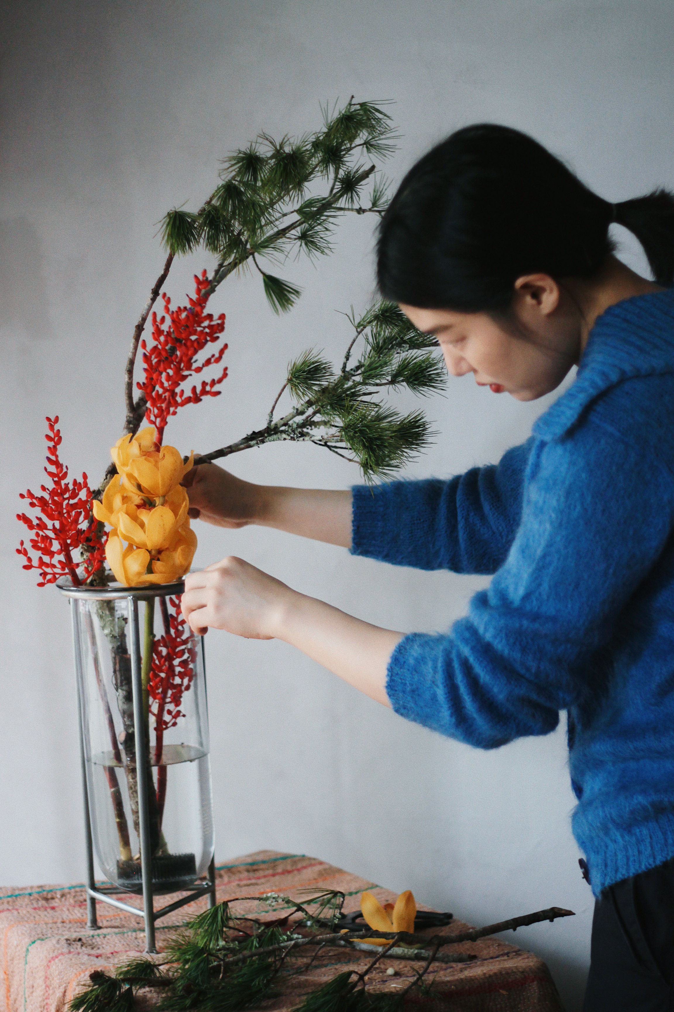搭配使用PUEBCO玻璃花器,其透明瓶身同時能欣賞到枝幹上的可愛樹苔,挑選花材時看到都會特別興奮☺️再加入虎頭蘭、珊瑚鳳梨點綴,色彩明亮充滿年節氛圍的插花即大功告成!