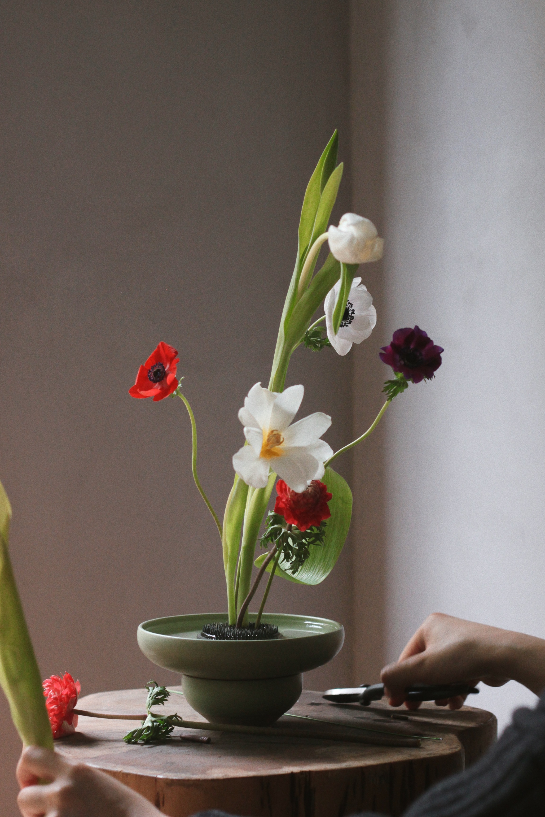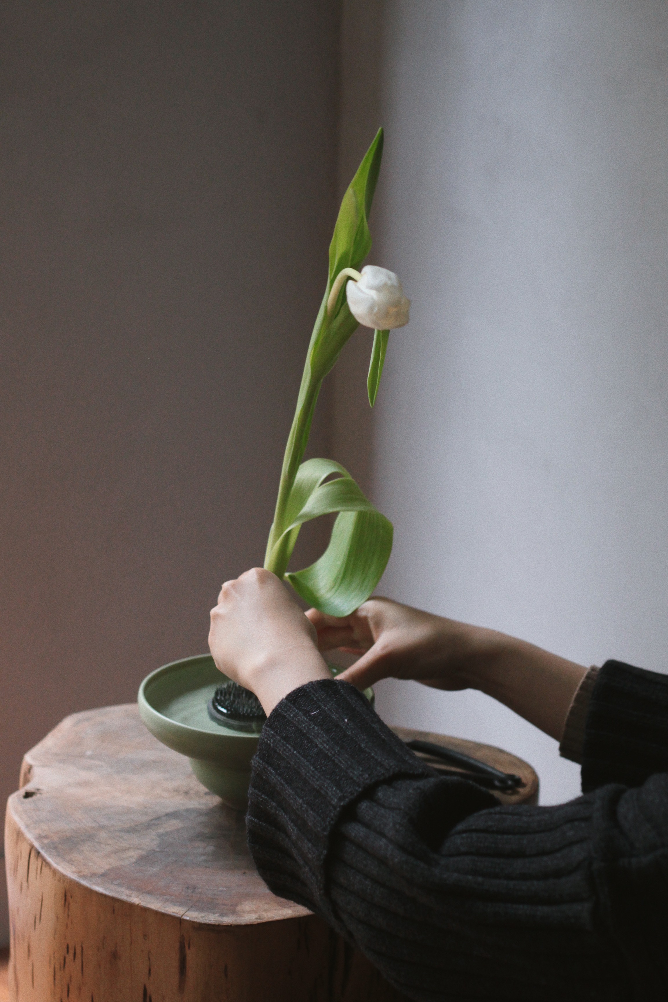 我們使用平時為食器的淡色弧形圓餐碗作為花器,並將兩款尺寸結合,做出上寬下窄的花器造型。