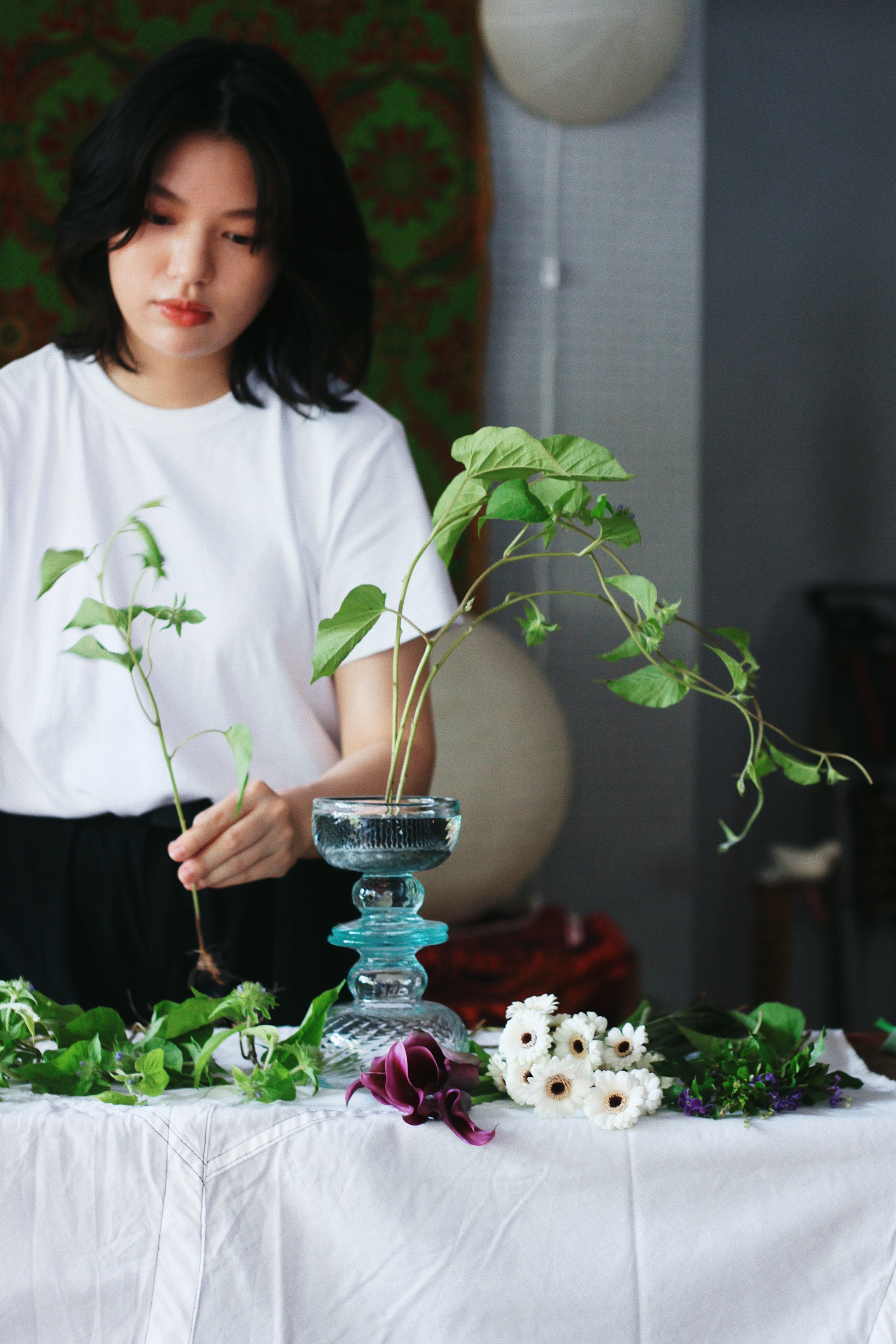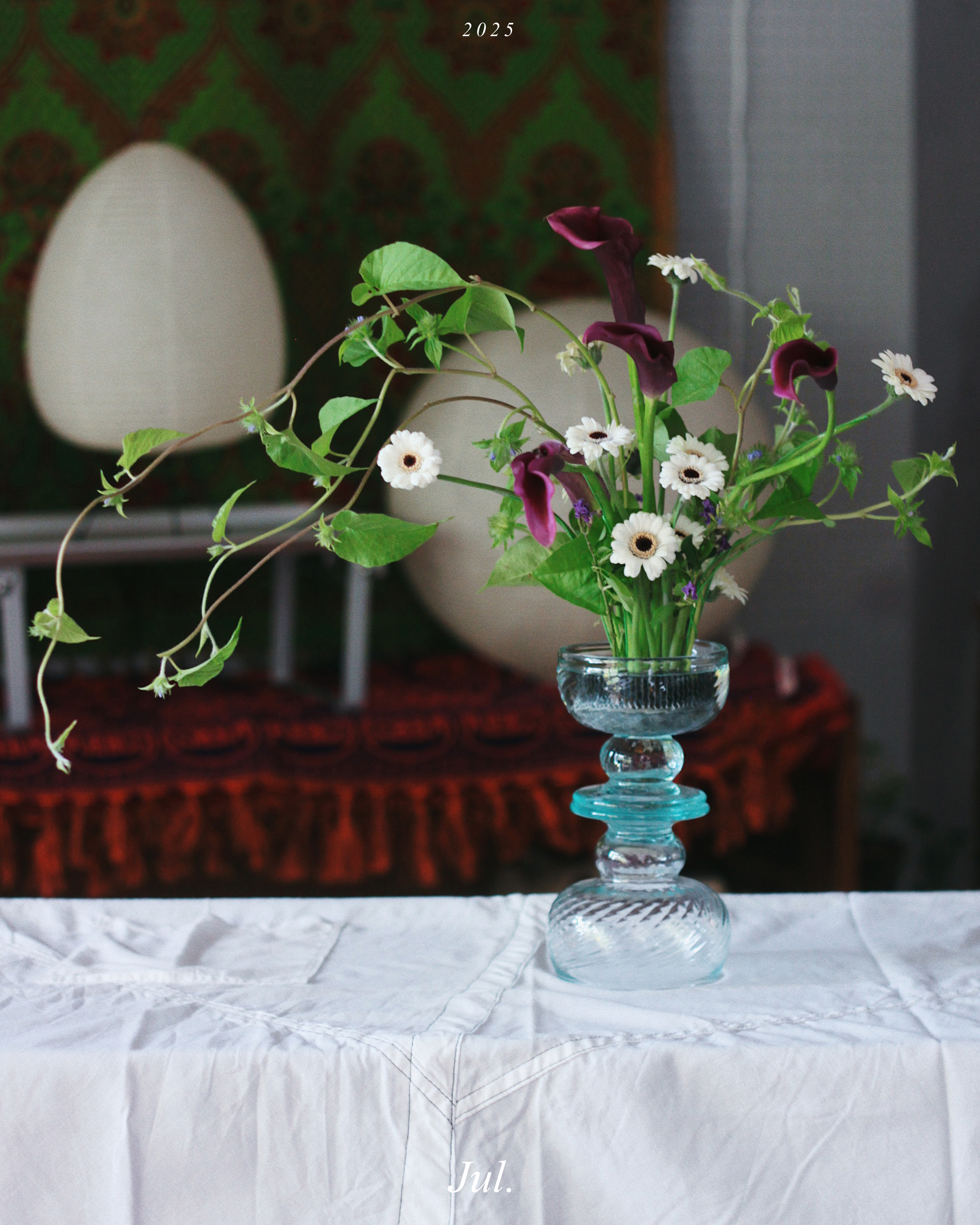 我們將 La soufflerie 的 Margaret 花器相互堆疊,營造高腳花器氛圍,輕透玻璃透出水藍色波紋,正適合此刻季節使用。
