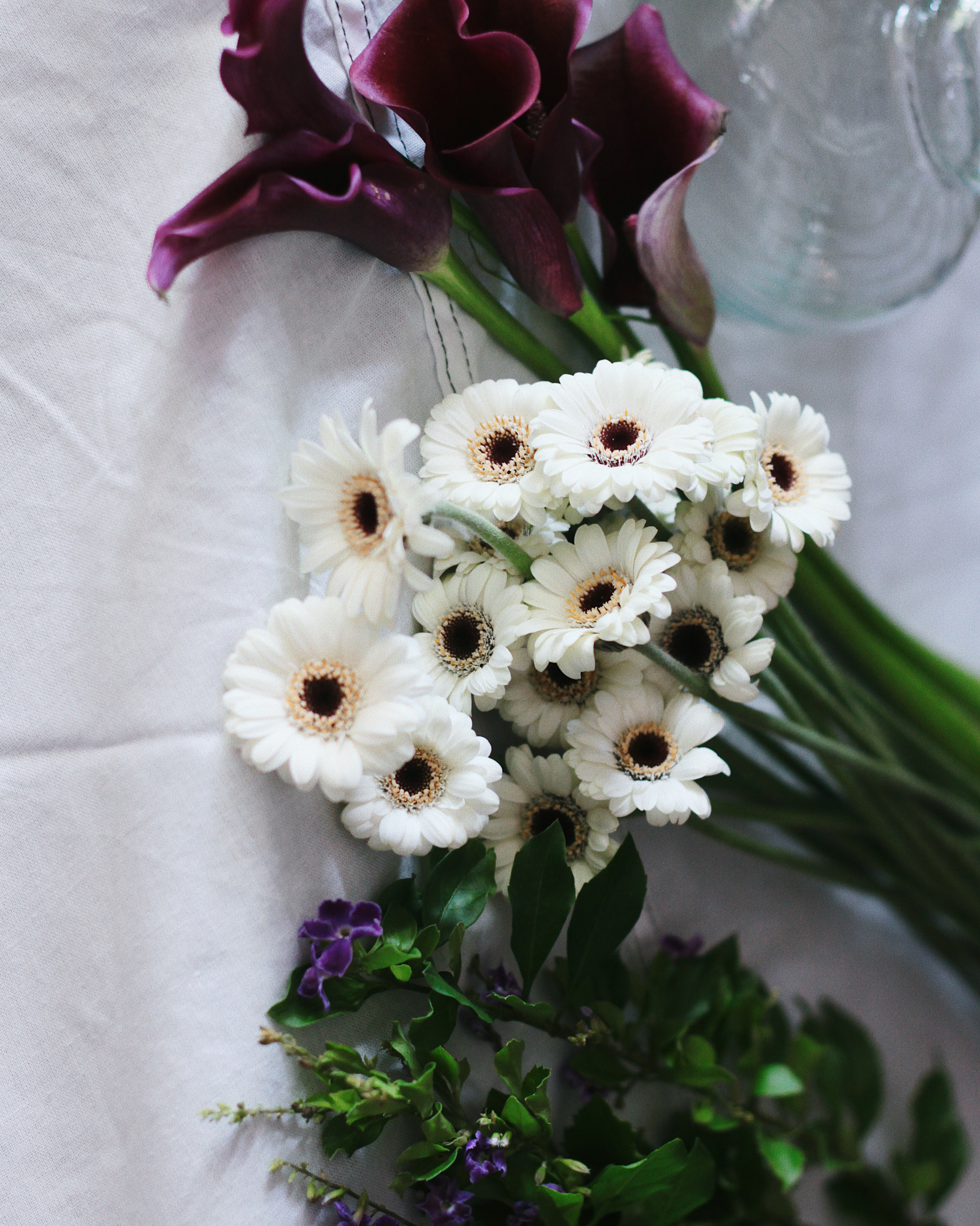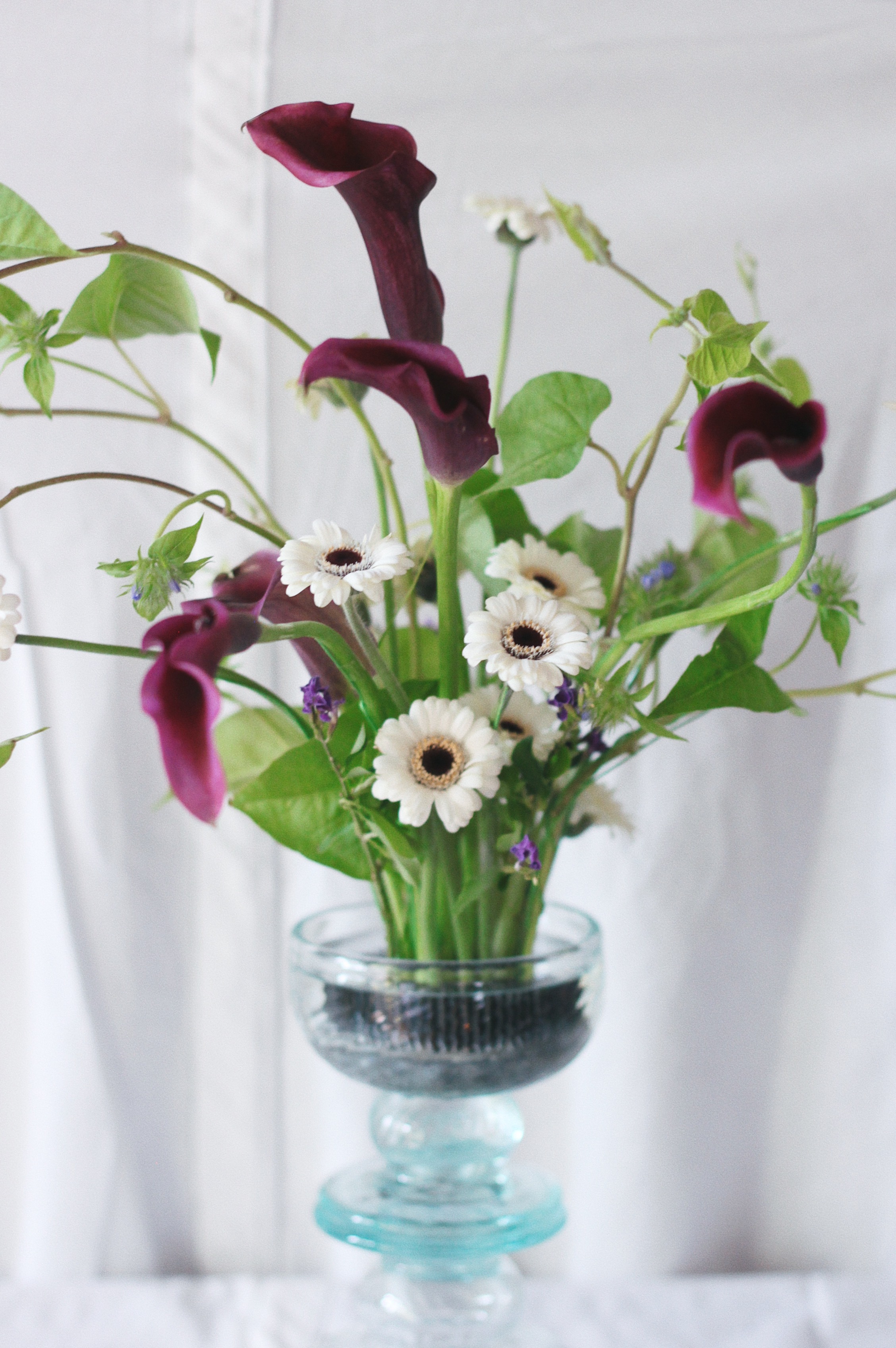花材:長梗毛娥房藤、臺灣黑海芋、迷你非洲菊