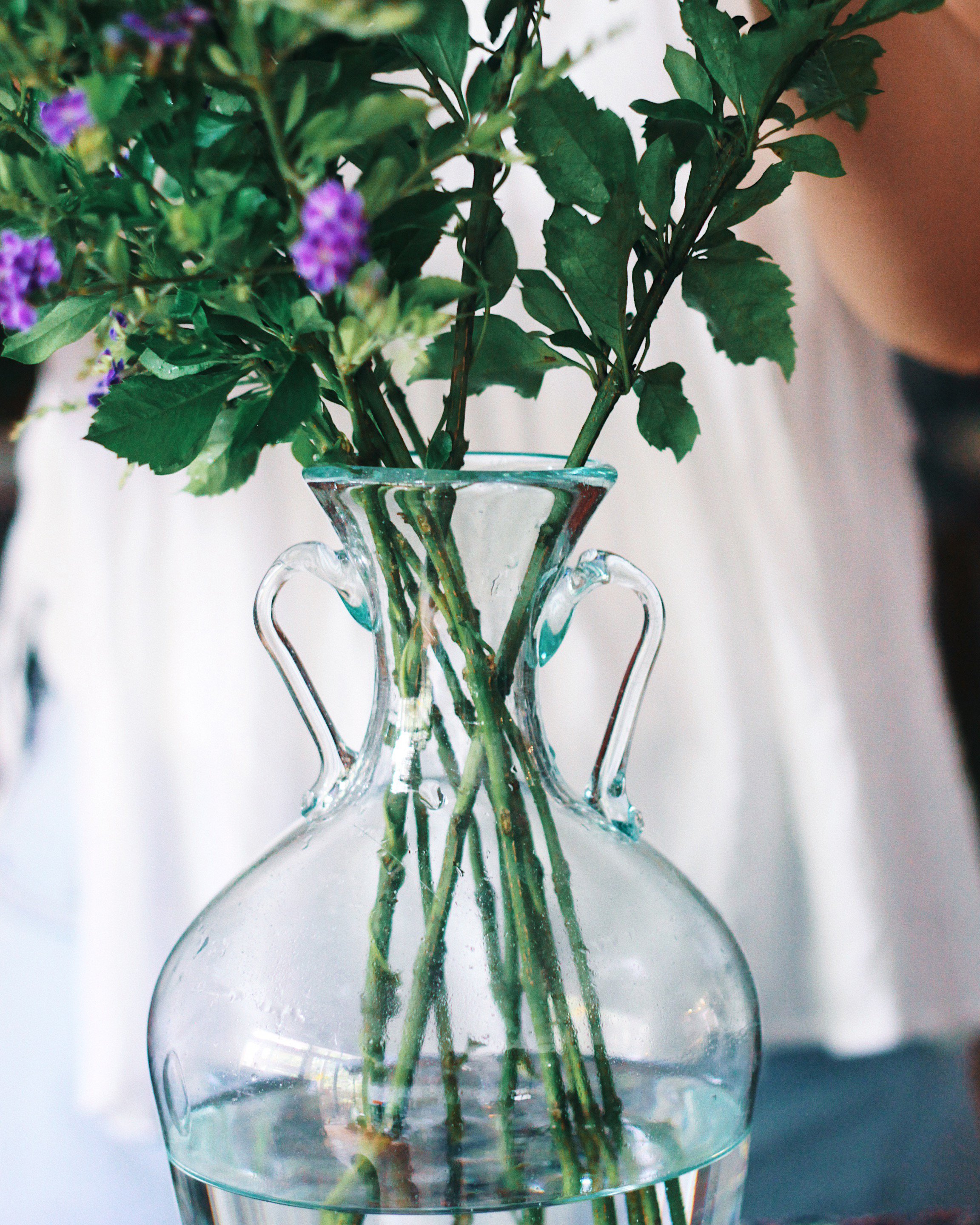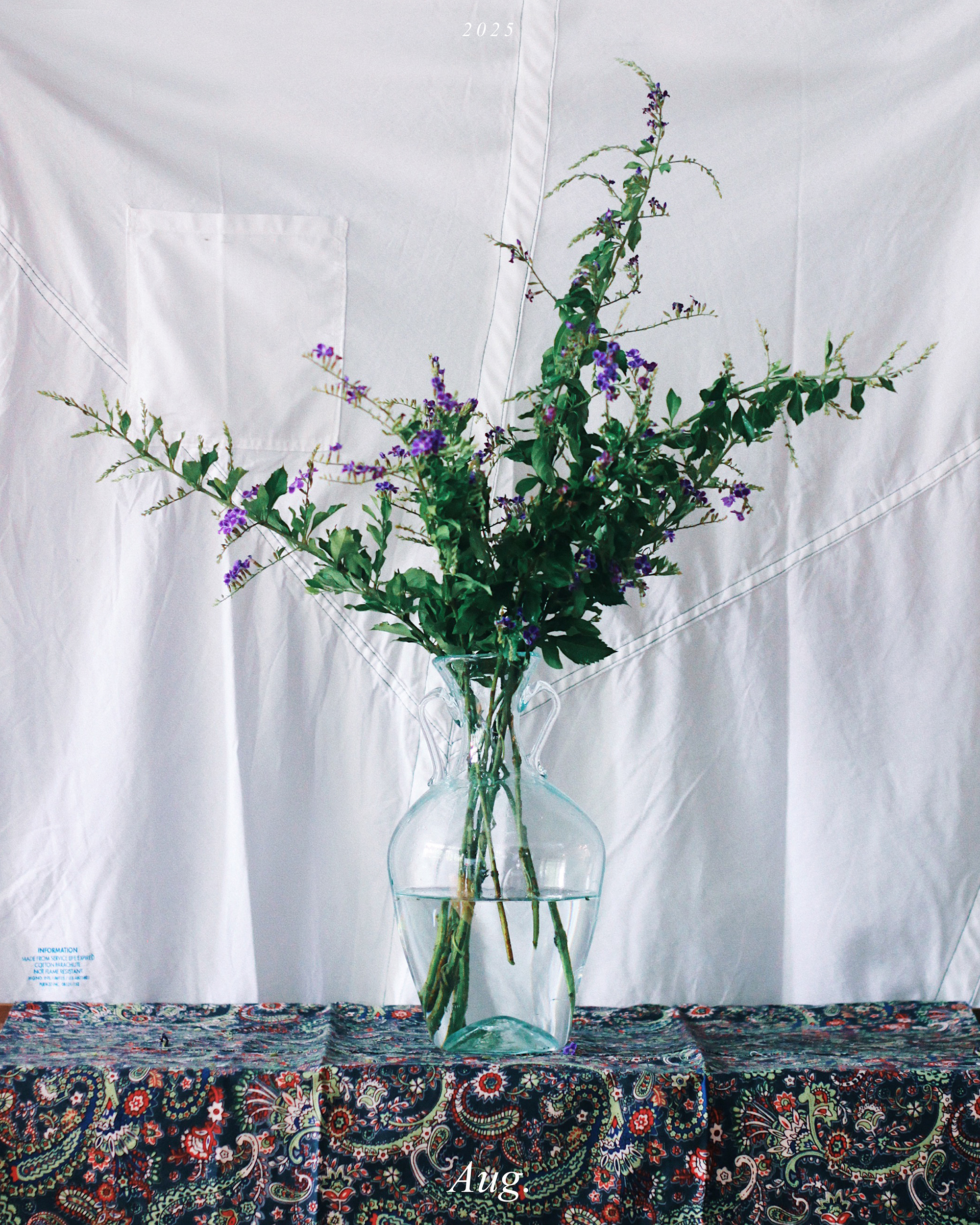 應景本月的父親節,單獨選用充滿尊敬與美好祝福的金露花來做主角,綠葉中竄出一朵朵深紫色小花,修剪尾端多餘葉片後直接置入法國 La Soufflerie 的 Amphora 雙耳瓶中,簡單又好看。