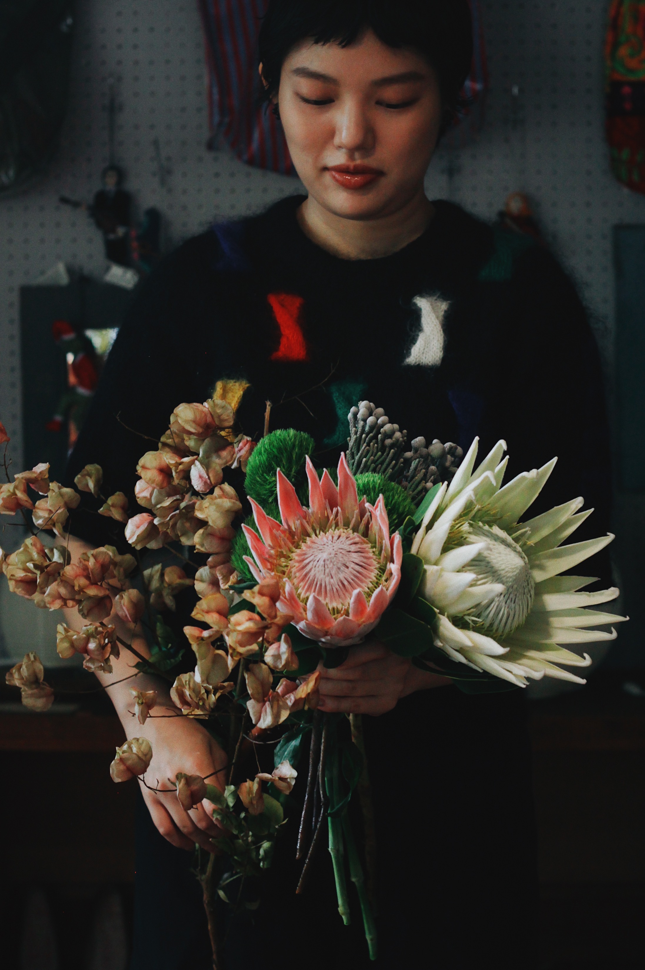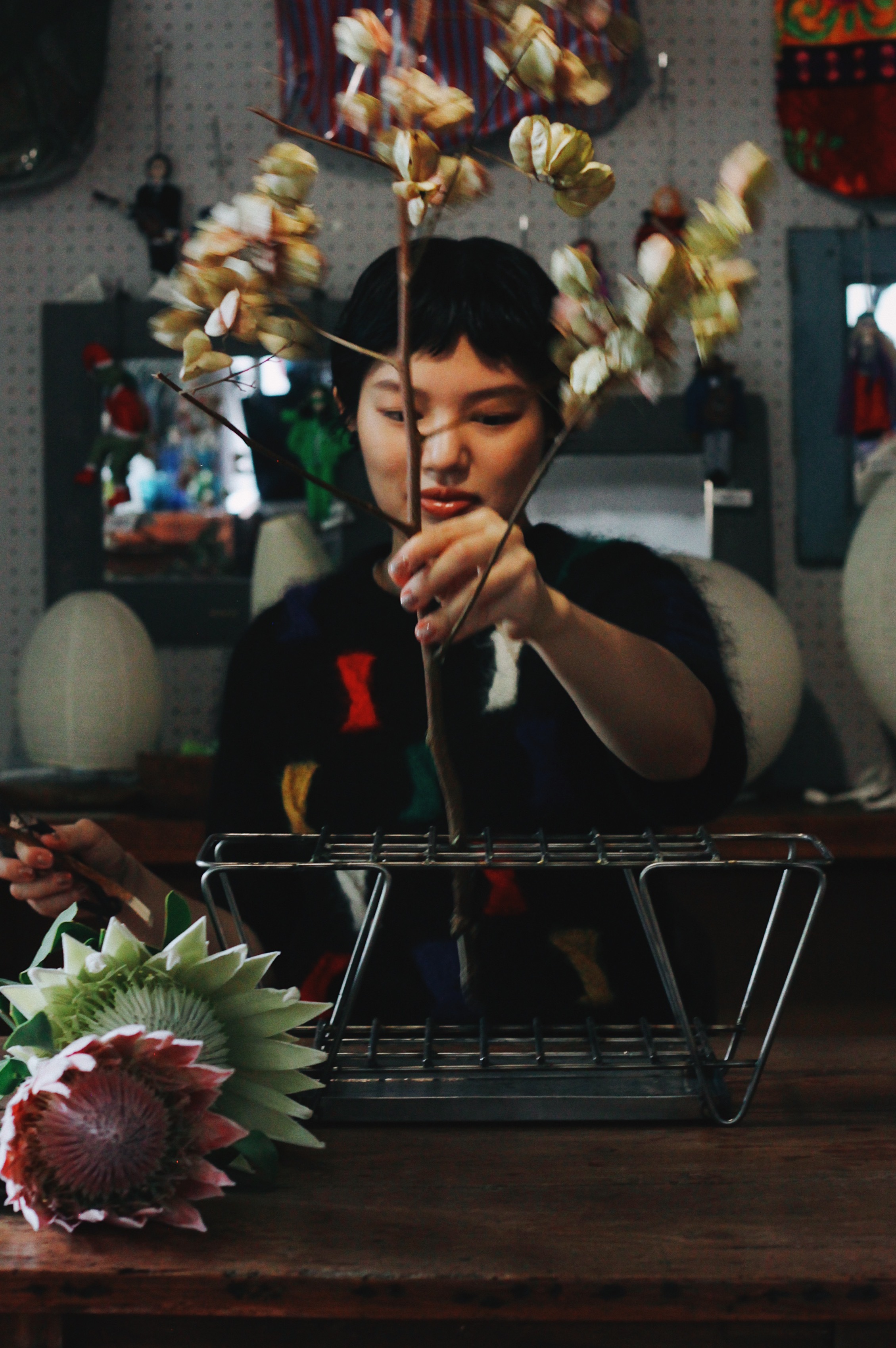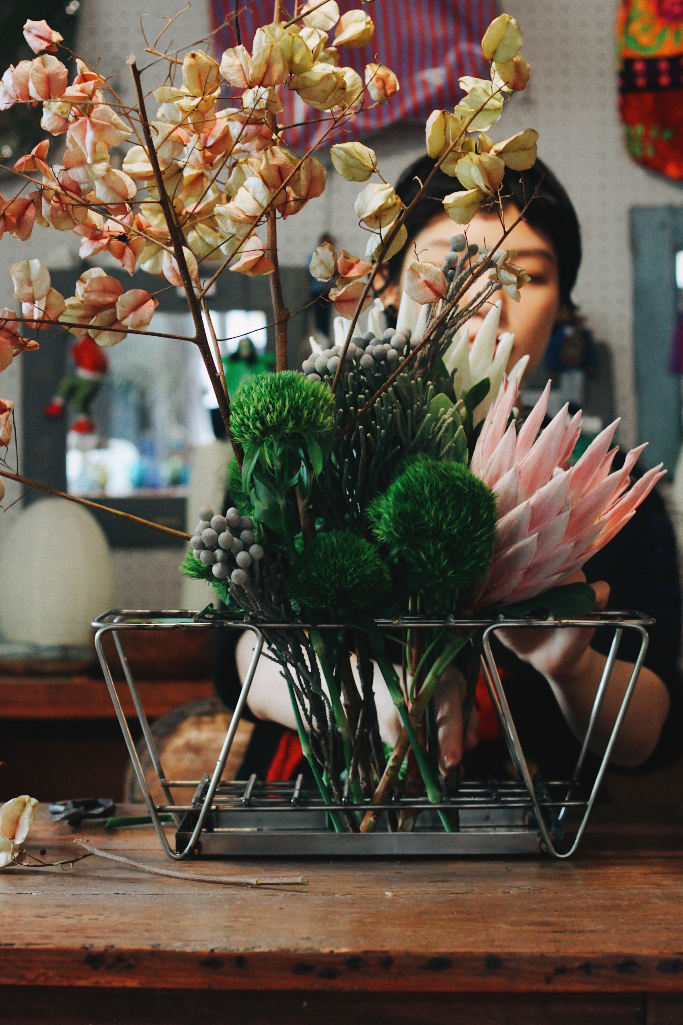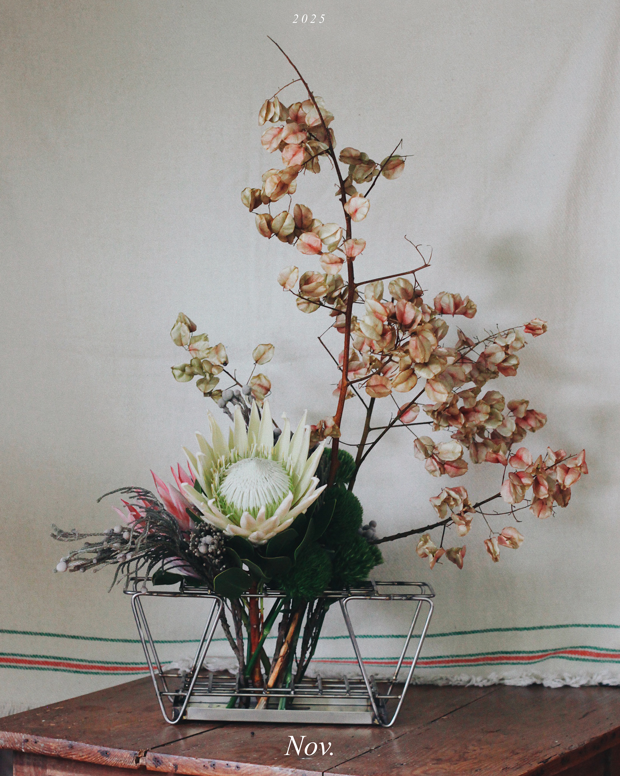 汲取蒴果的粉色及黃白色來選擇本次的主花 - 帝王花,以大份量的帝王花與欒樹取得畫面平衡,再將毛絨感十足似兔尾巴的綠石竹鋪底襯托,最後以銀果點綴。帝王花有帶著圓滿的含義,祝福各位都能夠幸福長久。